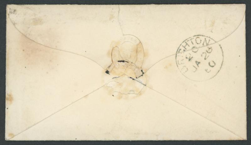 1860 (Jan 25) small envelope with Oxford Union Society crest on reverse (slightly damaged where wax seal removed) and QV