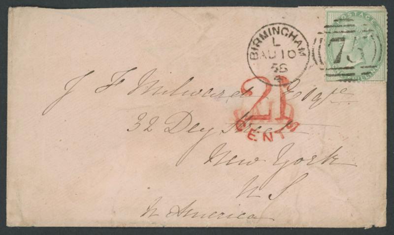 very fine strike of Birmingham '75' duplex cancel, London 'PAID' cachet in red on the face and 'AU 11/58' transit backstamp in red, largely very fine complete '21/CENTS' accountancy handstamp in red on the face for the USA portion of the postage paid