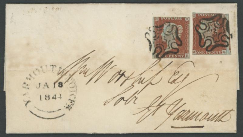 1844 (Jan 17) entire letter to Great Yarmouth with QV Line-Engraved Imperf 1d red-brown singles x2 [KD] & [MG] (stated to be Plate