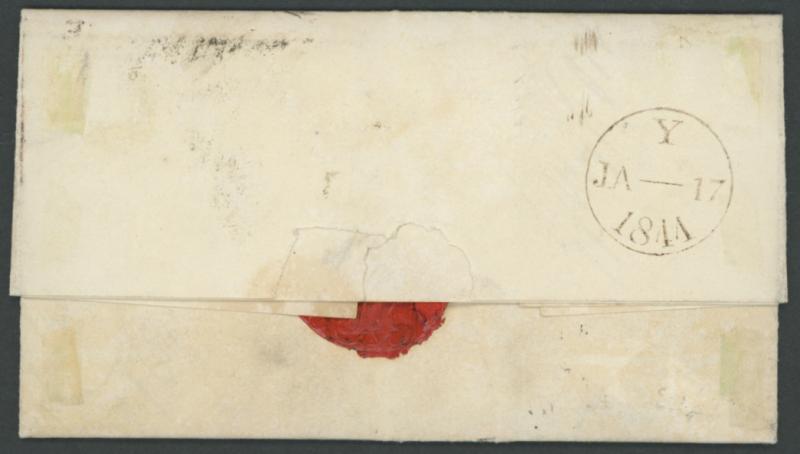 with 'PONTEFRACT/JA29/1844' backstamp, at Sydney re-rated "3d" for an inter-colonial shipletter & partial 'SHIP LETTER/17JU17/1844' arrival backstamp of Launceston, ink-stains on the face; 2) Seventh Sailing per 'Sarah Sands' outer to NSW with London