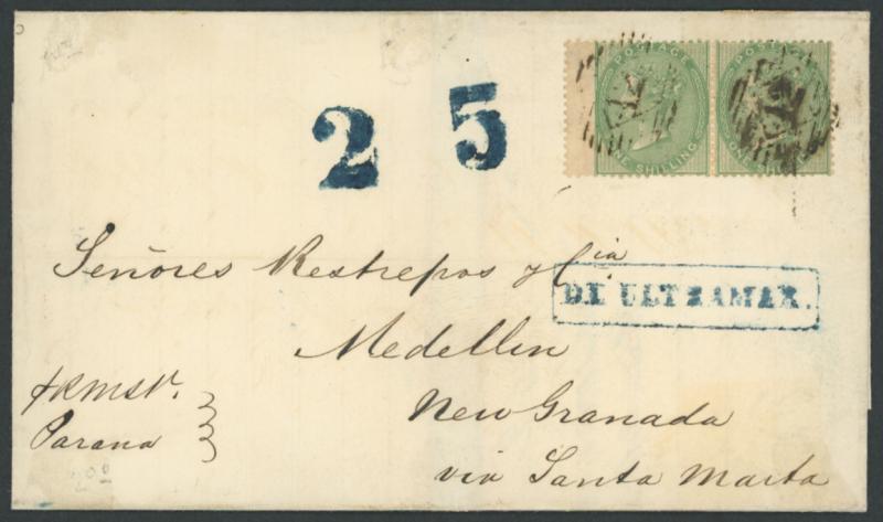 ULTRAMAR' [From Over the Seas] boxed handstamp and '2 5' inland delivery charge cachets all in blue on the face, minor blemishes. Santa Marta, on the northern coast of Colombia, was its major port on the Caribbean Sea; at this time, the trip to