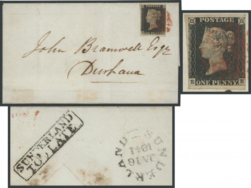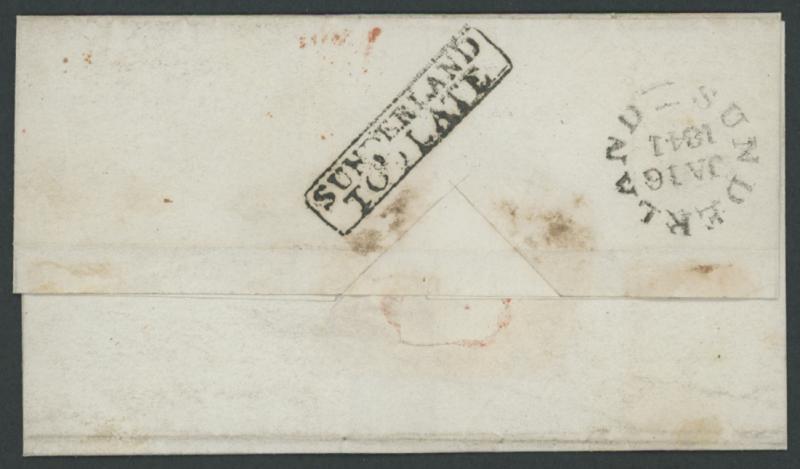 cancel in red with largely very fine 'SUNDERLAND/JA16/1841' despatch backstamp and largely very fine complete strike of the scarce 'SUNDERLAND/TOO LATE' boxed handstamp alongside on the reverse, light horizontal folds clear of the adhesive & markings