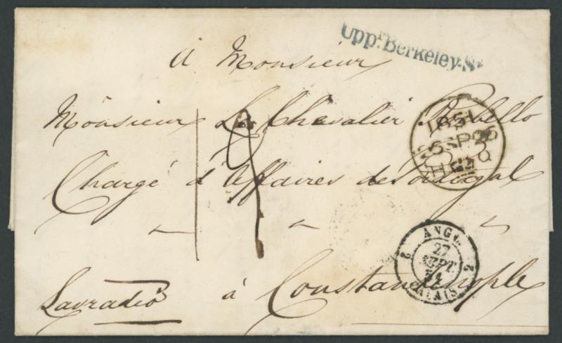 1851 (Sept 26) unstamped entire to Constantinople, Turkey with London Local Posts 'Uppr Berkeley St' single-line despatch handstamp