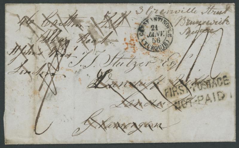 then Brunswick Square with largely very fine London 'FIRST POSTAGE/NOT-PAID' handstamp on the face where the original "1/-" rating was crossed out and replaced by "1/1"[d] to include the redirection charge, two vertical file folds slightly affecting