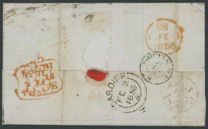 face, to Glamorgan, Wales overland via France by train with 'PARIS A CALAIS 2o/31/JANV/56' TPO transit, London '1 FE 1' transit in red and very fine to superb 'CARDIFF/FE 2/1856/ A ' arrival in black on the reverse, redirected to St John's Wood and