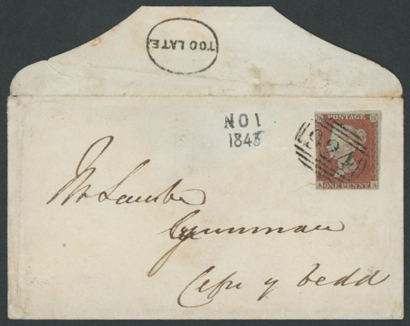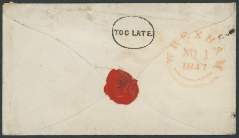 by very fine Numeral '924' horizontal oval-of-bars and 'WREXHAM' despatch backstamp in red alongside very fine to superb complete strike of 'TOO LATE.' oval-ringed handstamp, Cwfn y Bedd un-named 'NO 1/1843' arrival handstamp on the face, a few minor