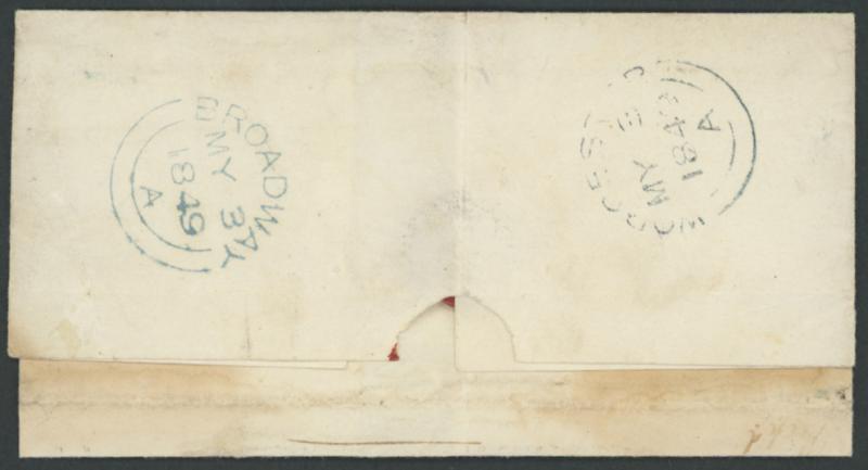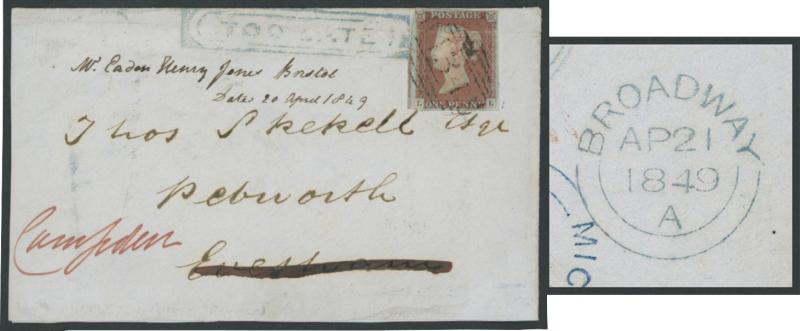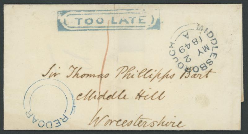 where rated "1"[d] paid on the face, transits of 'MIDDLEBOROUGH/MY 2/1849' on the face, 'WORCESTER/MY 3/1849' on the reverse and 'BROADWAY/MY 3/1849' also on the reverse where largely very fine complete 'TOO LATE' ornate rounded-boxed handstamp in
