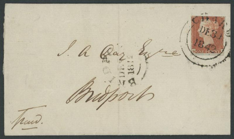 1842 (Dec 30) entire letter to Bridport with QV Line-Engraved imperforate 1d red-brown Blued Paper SG 8 Plate 19 [NI] (cut-into at