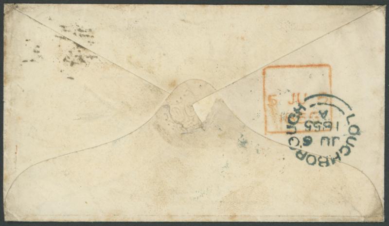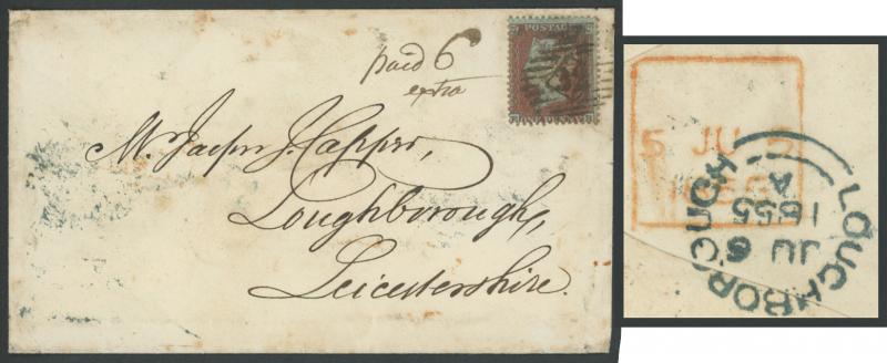 '32', square Late Fee datestamp (no inscription) in red on the reverse and endorsed "paid 6d extra" on the face alongside the adhesive, very fine complete 'LOUGHBOROUGH' arrival backstamp of the next day, a few minor blemishes. The 6d late fee