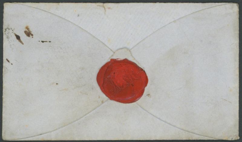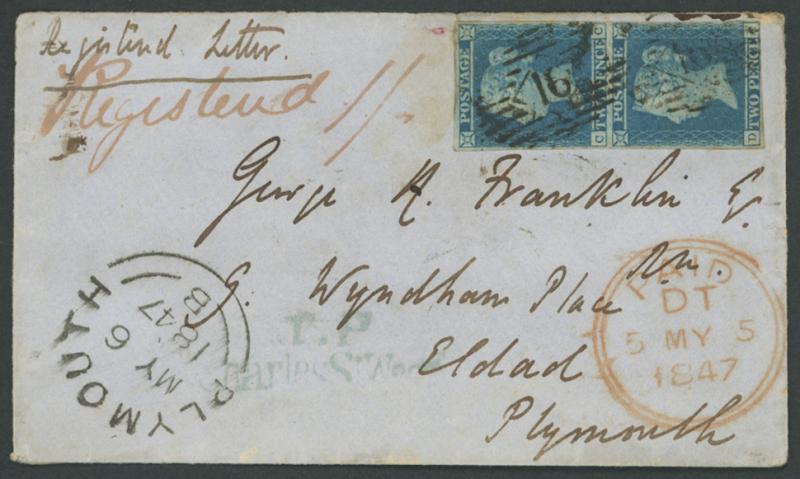 in red for the registration fee paid in cash with London 'PAID' cds at lower-right, very fine 'PLYMOUTH/MY 6/1847/ B ' arrival datestamp also on the face, minor blemishes & back flap missing (no markings on the reverse). The registration fee was
