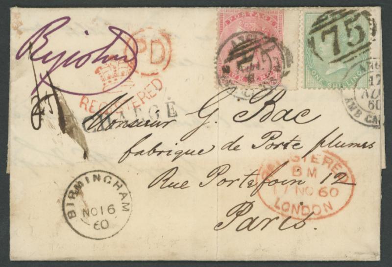 1860 (Nov 16) entire containing two bills for 2500 francs, to Paris endorsed "Registered" with QV Surface-Printed No Corner Letters