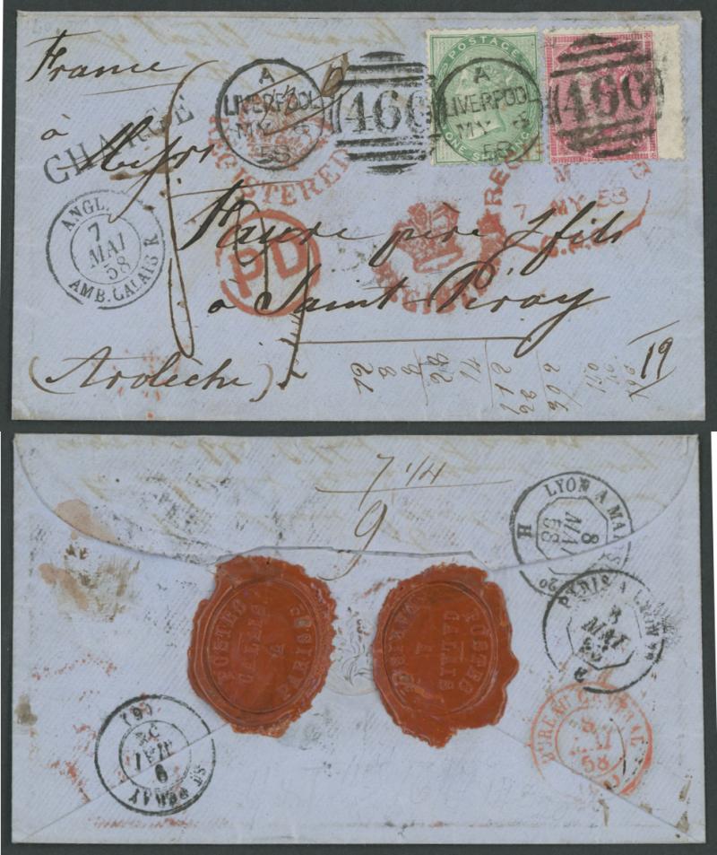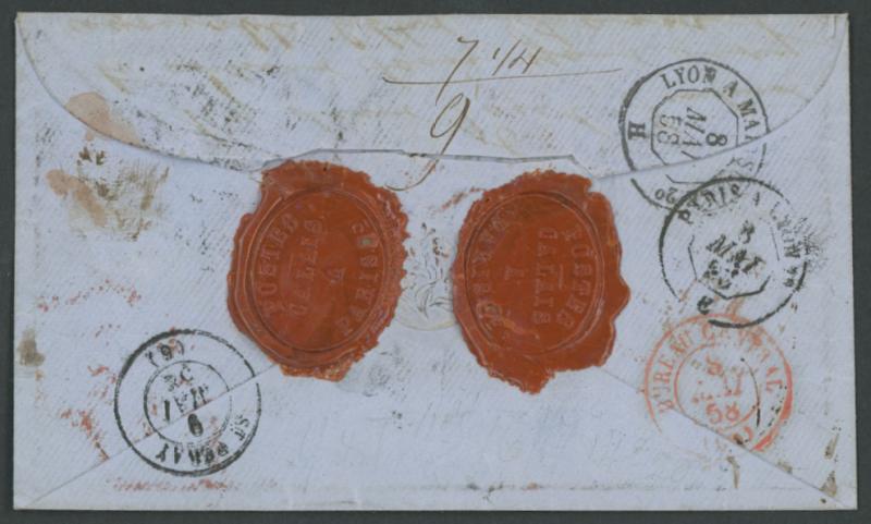 face, French 'CHARGE' cachet and 'ANGL/AMB CALAIS' TPO transit cds on the face where most unusually resealed with two 'POSTES/CALAIS/A/PARIS' wax seals in red on the reverse with 'BUREAU CENTRAL/8/MAI/58' cds in red alongside, also 'PARIS A LYON' &