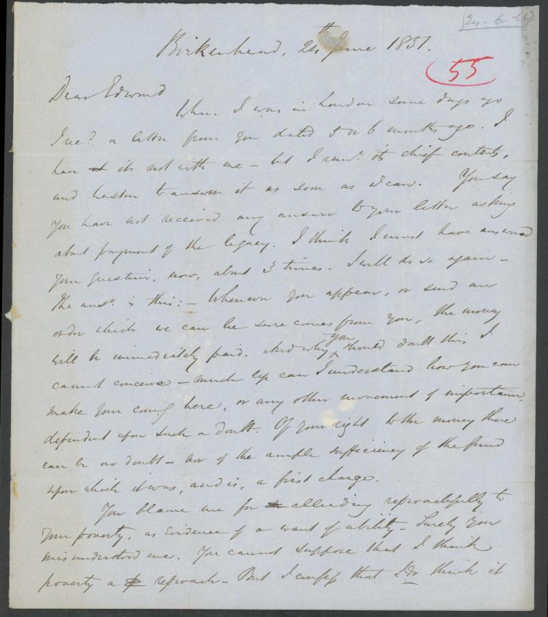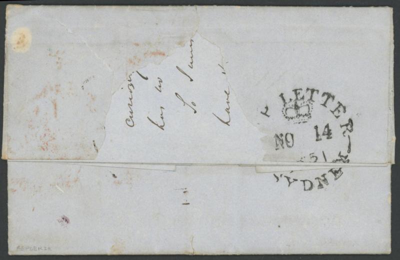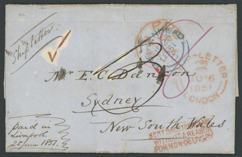 1851 (June 25) unstamped entire to "Mr EC Danson, Sydney, New South Wales" headed "Birkenhead, 24th June 1851" and endorsed "Paid