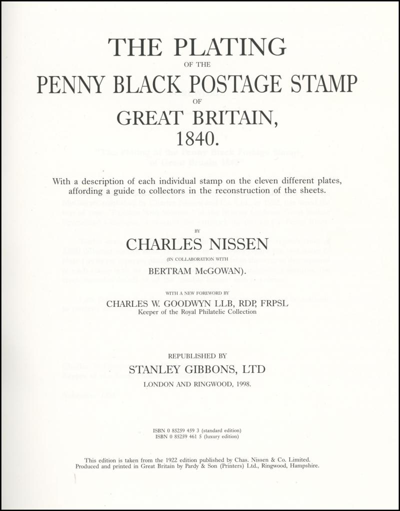 'The Plating of the Penny Black Postage Stamp of Great Britain 1840' by Charles Nissen (1922), republished by Stanley Gibbons