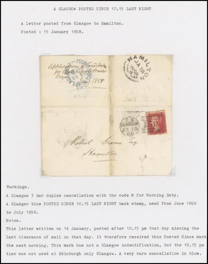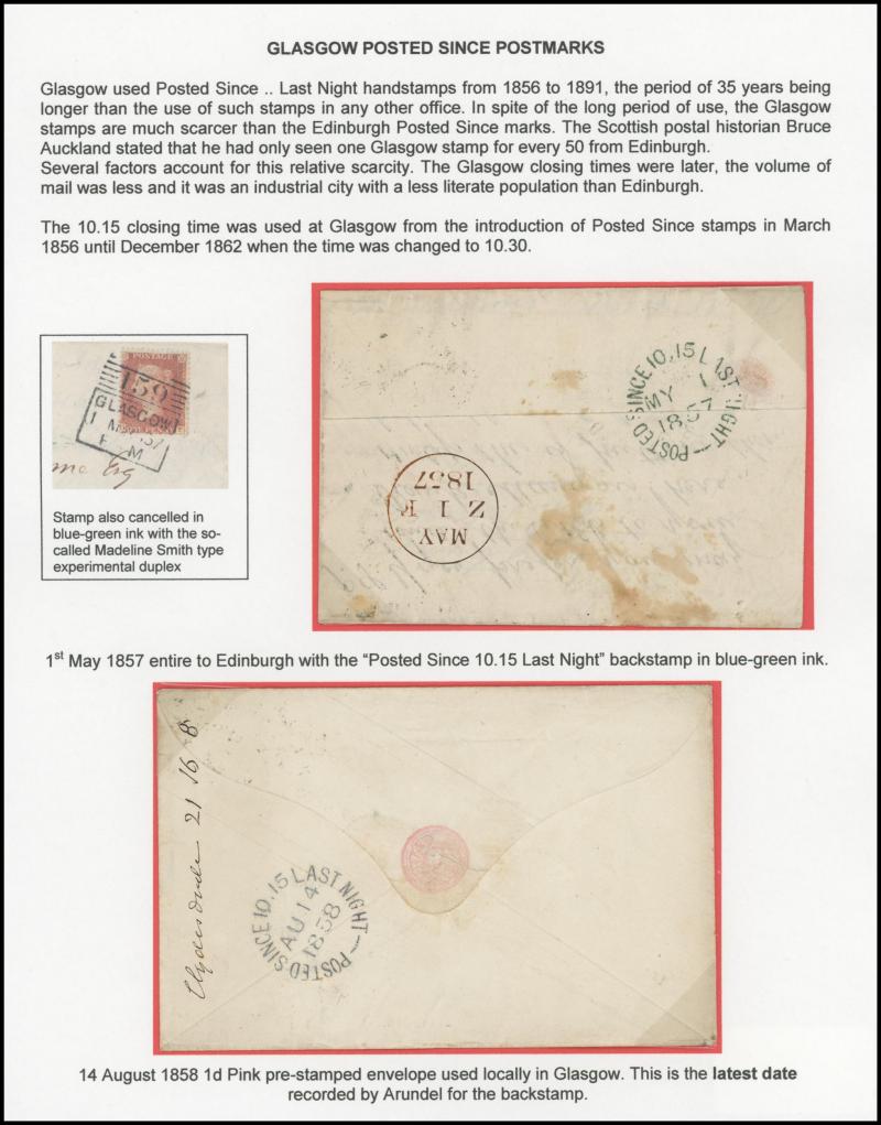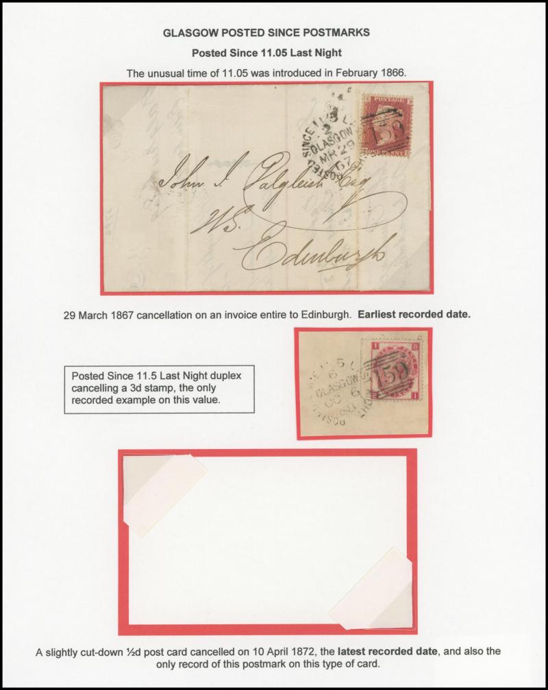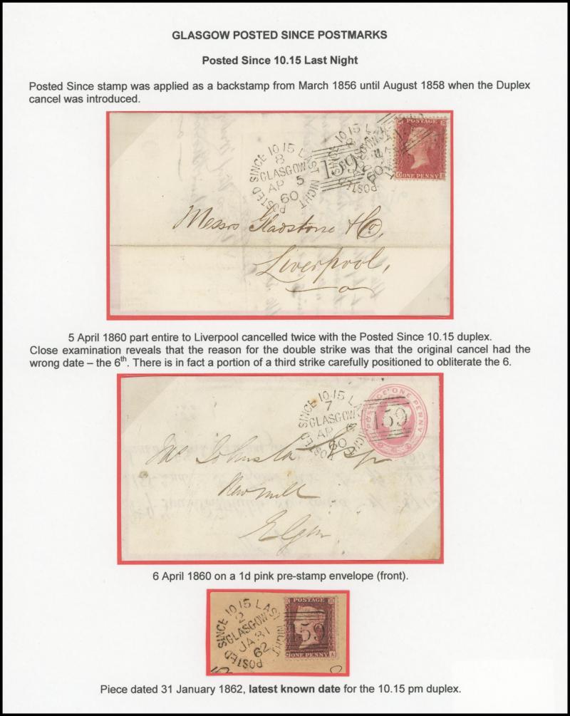 POSTMARKS: Glasgow 'POSTED SINCE' duplex cancels on cover group on annotated display pages including '10 15 LAST NIGHT' on 1859