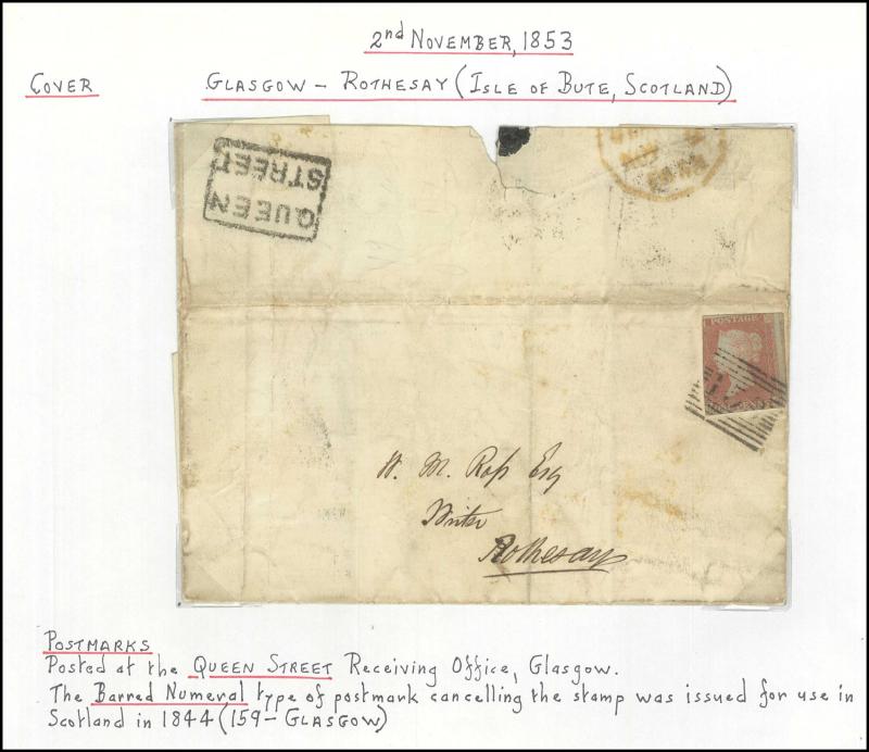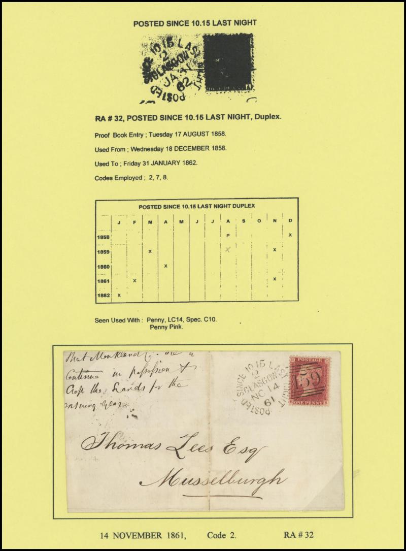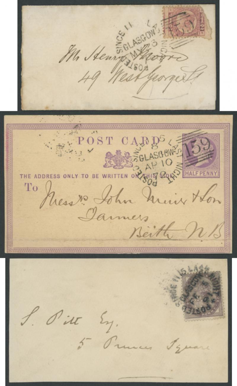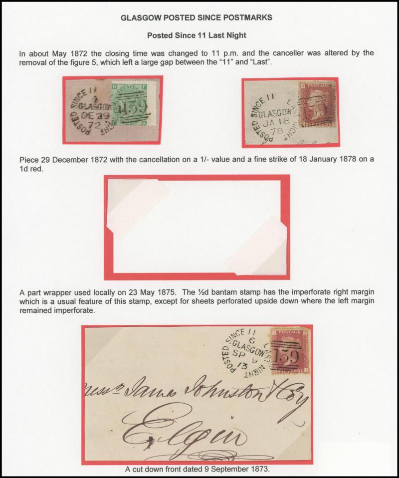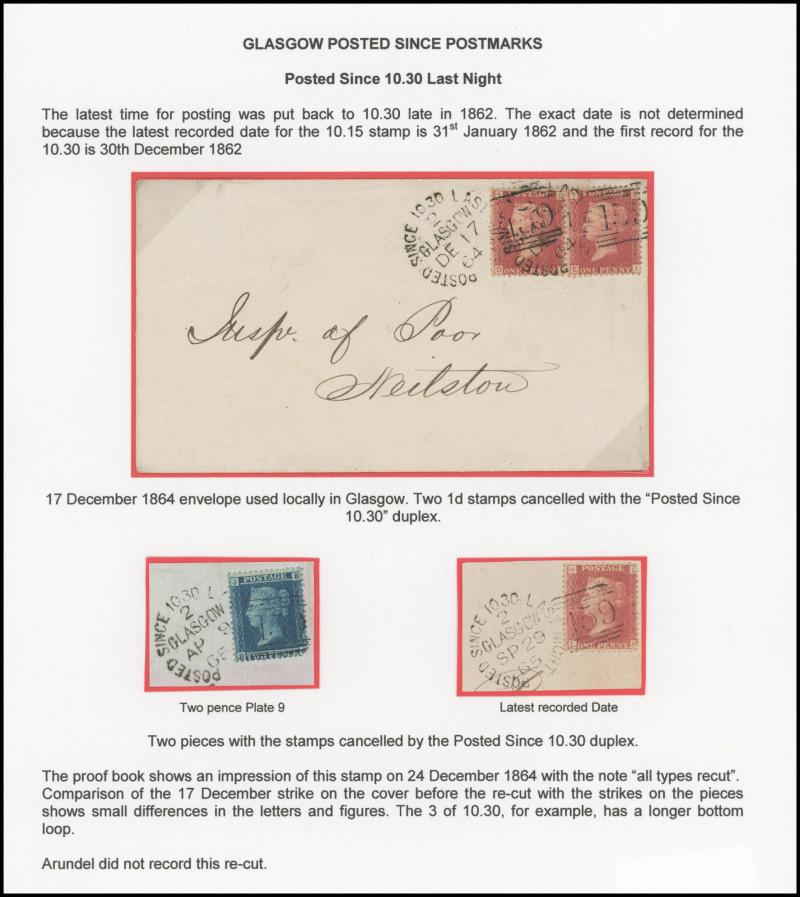 POSTMARKS: Glasgow 'POSTED SINCE' duplex cancels on cover group on annotated display pages including '10 15 LAST NIGHT' on 1859