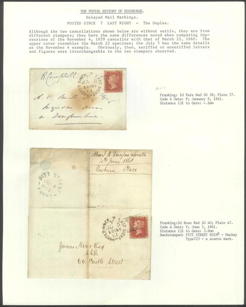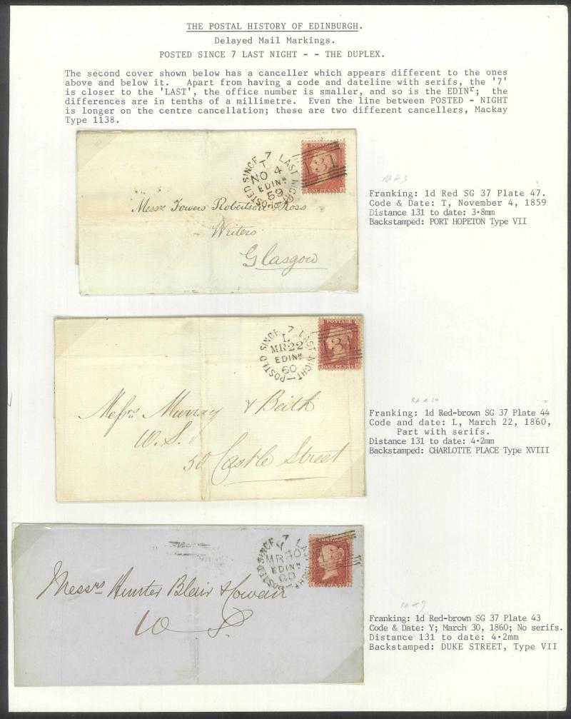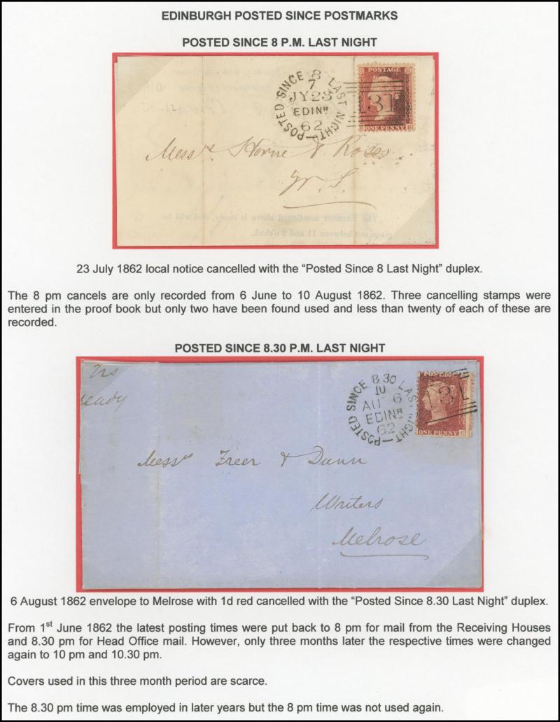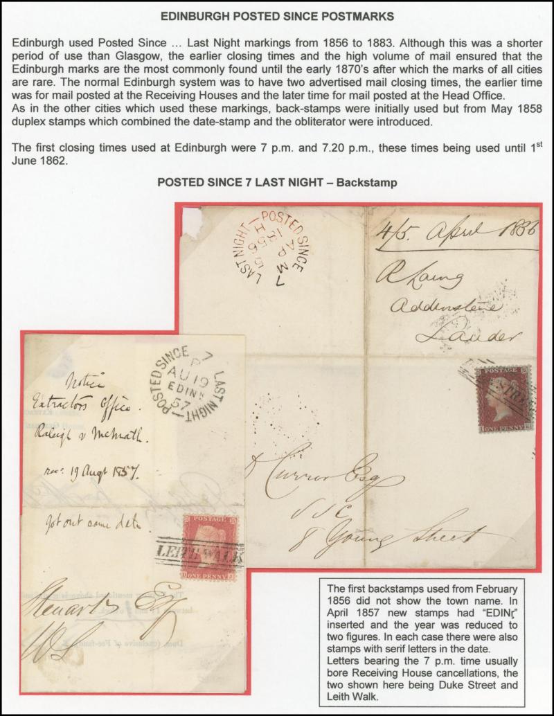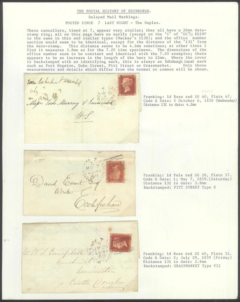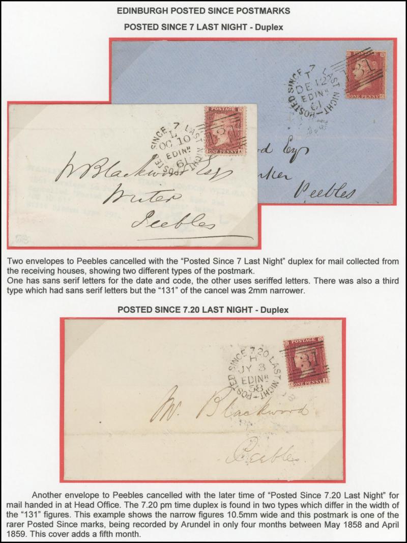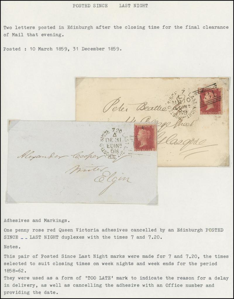 POSTMARKS: Edinburgh 'POSTED SINCE' duplex cancels on cover mostly on annotated display pages from '... 7 LAST NIGHT/FE27/1856/ H '