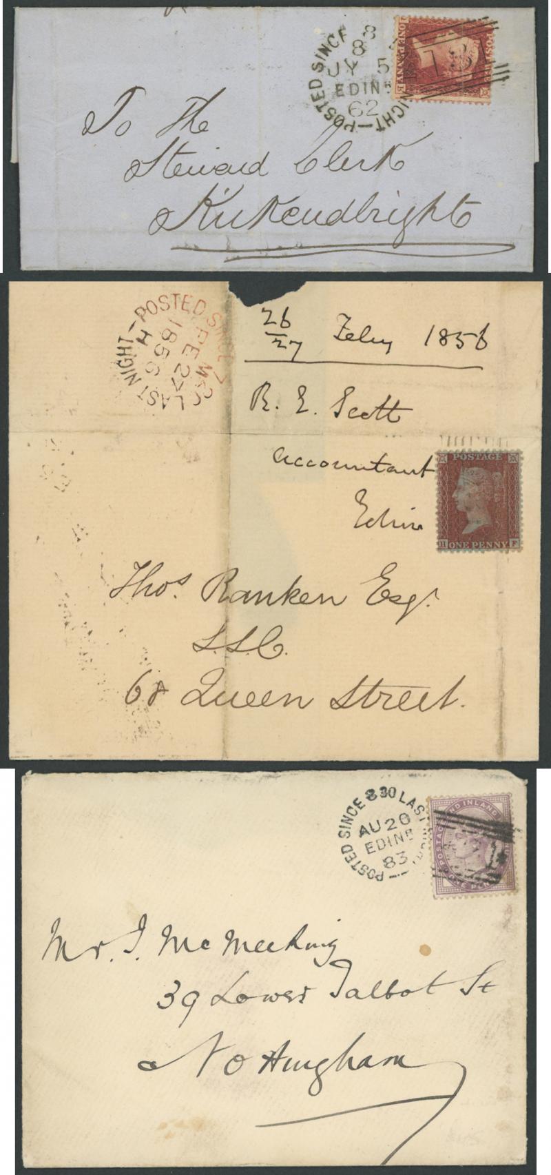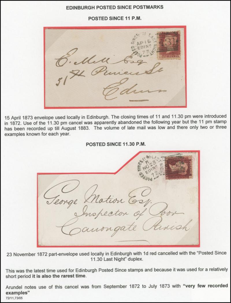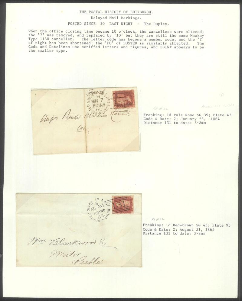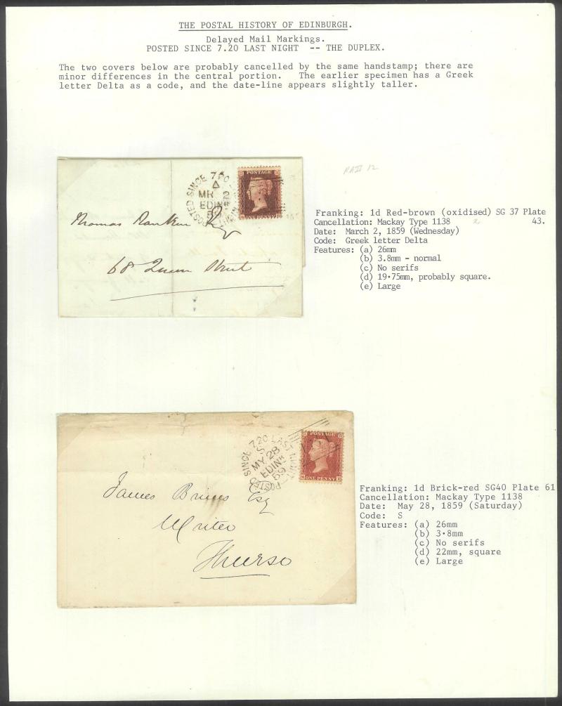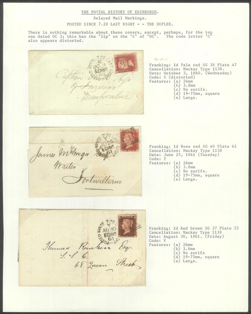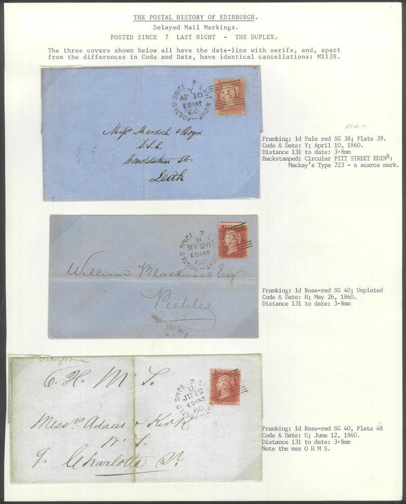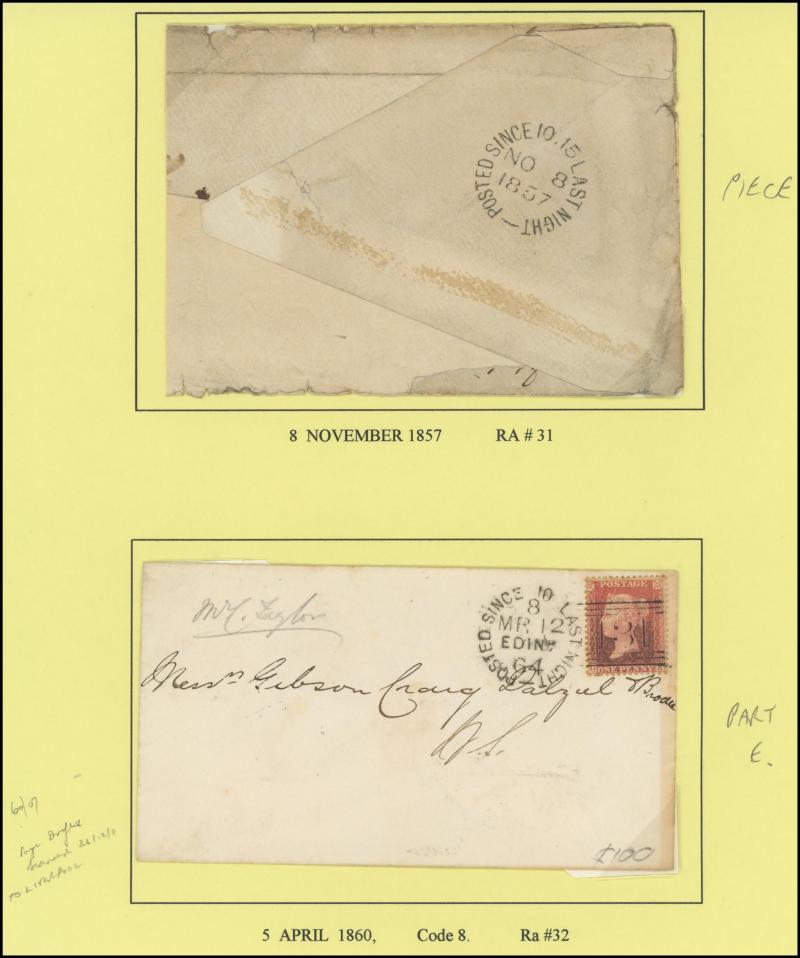 POSTMARKS: Edinburgh 'POSTED SINCE' duplex cancels on cover mostly on annotated display pages from '... 7 LAST NIGHT/FE27/1856/ H '