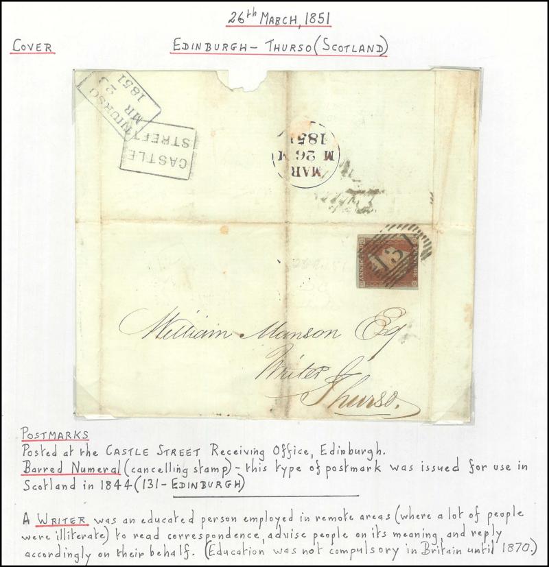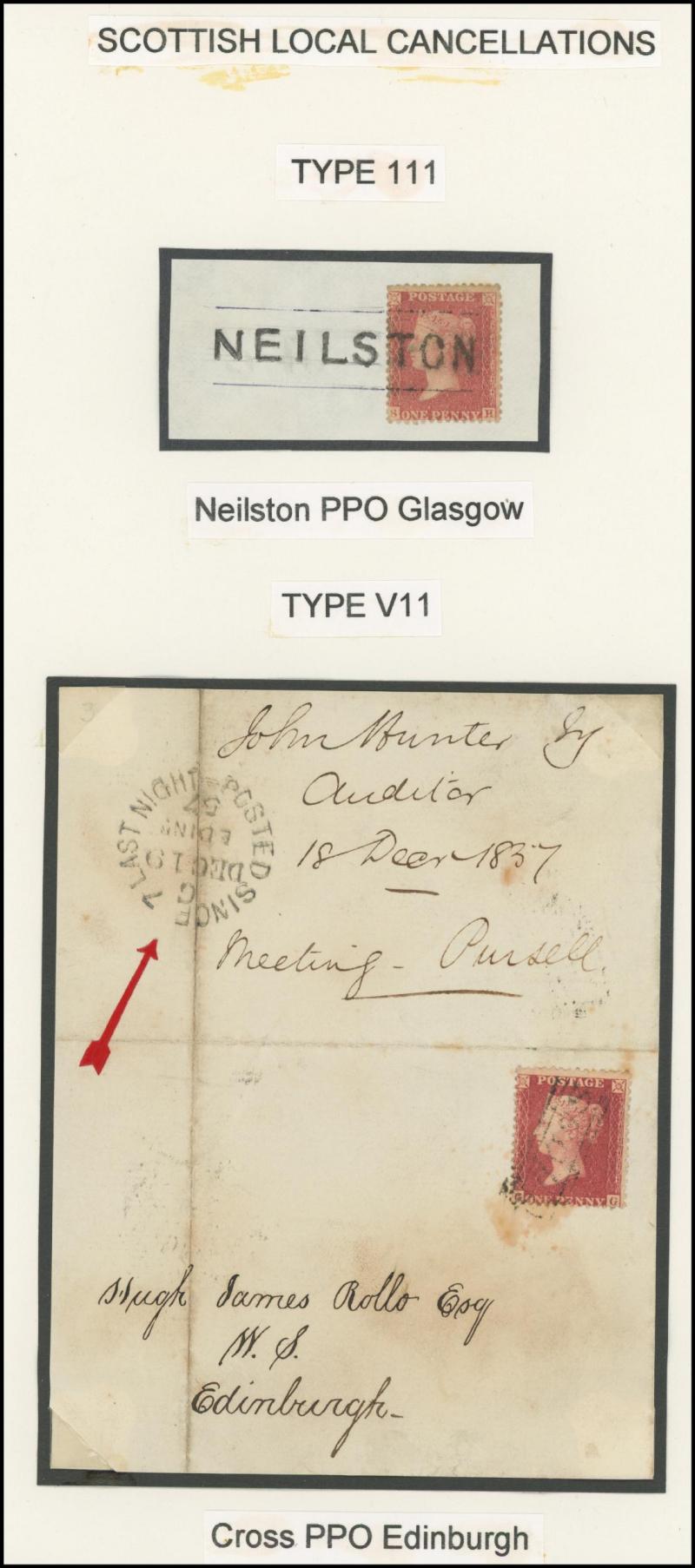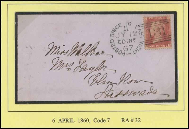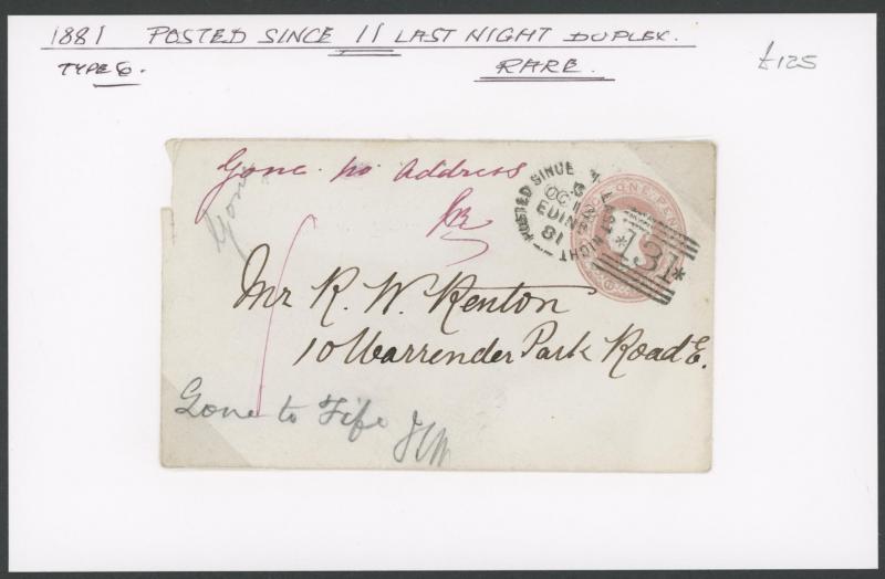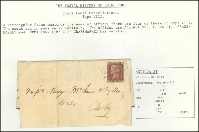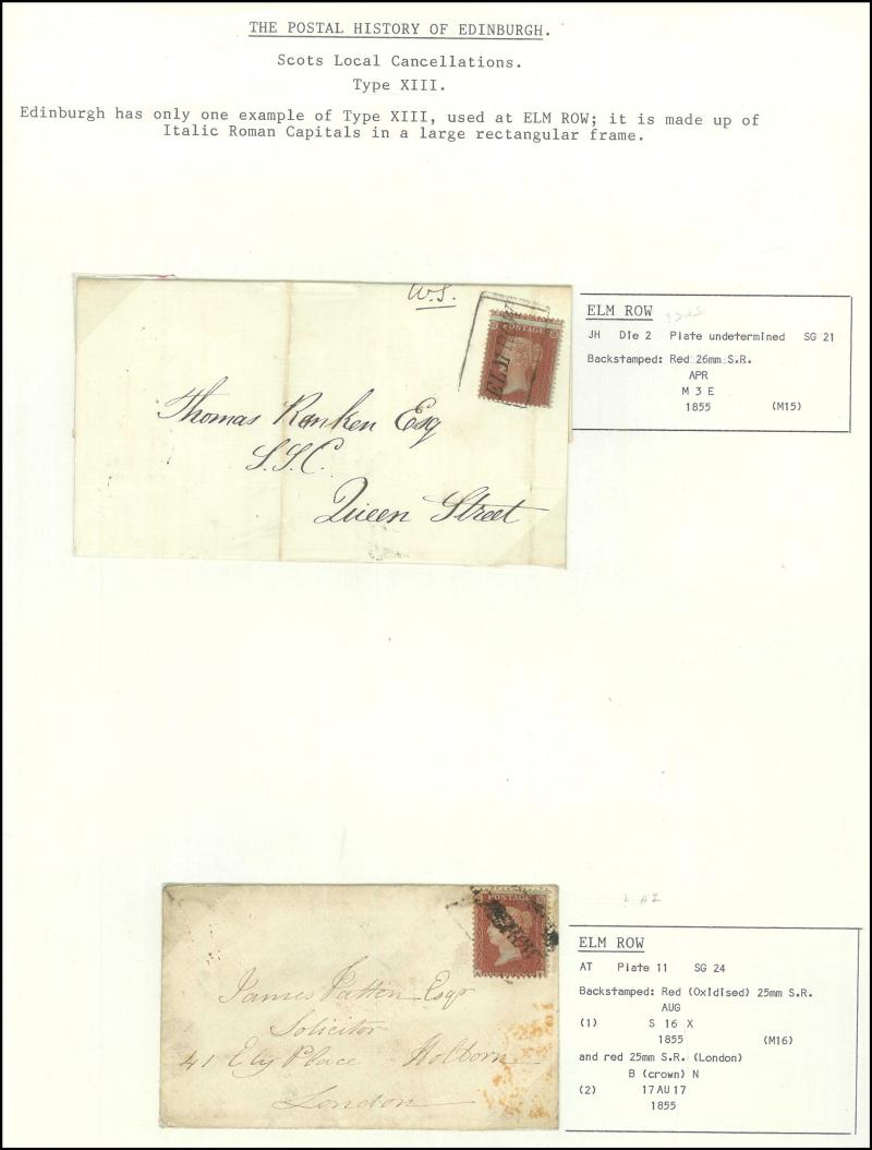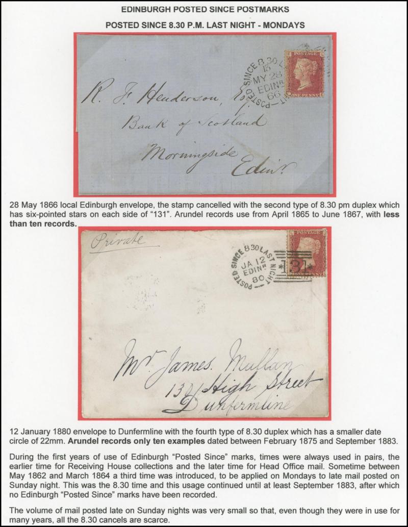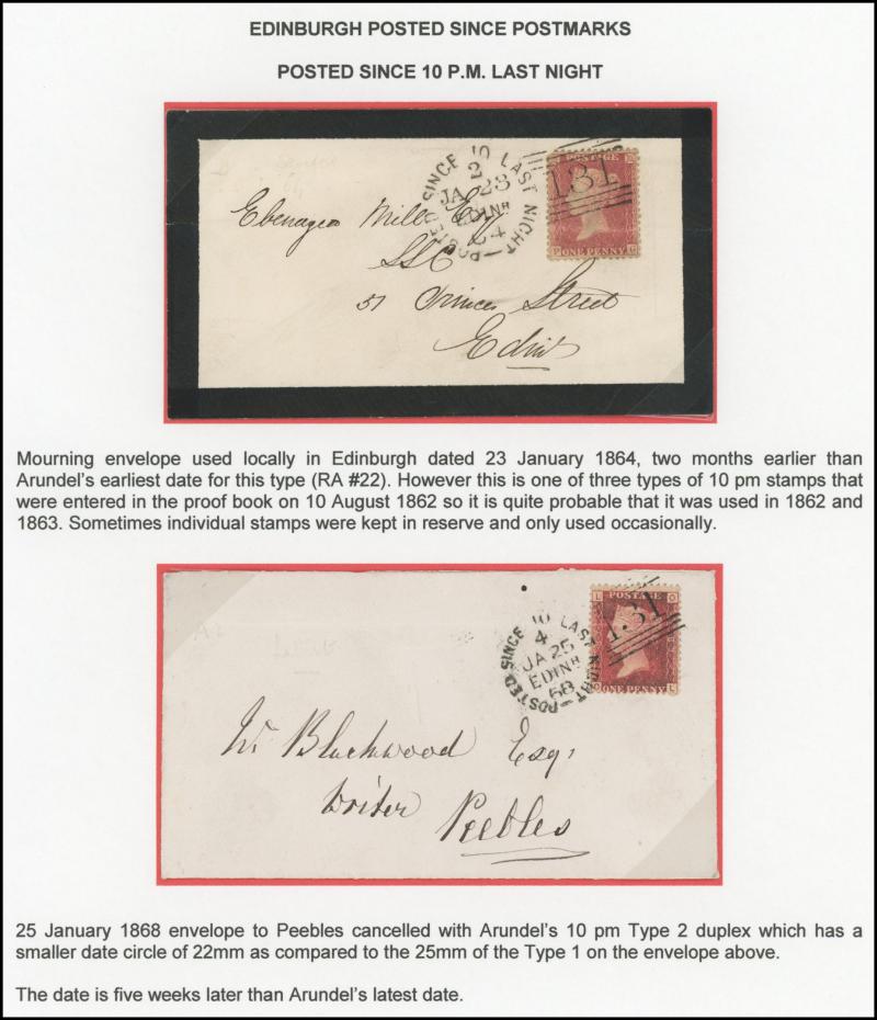 POSTMARKS: Edinburgh 'POSTED SINCE' duplex cancels on cover mostly on annotated display pages from '... 7 LAST NIGHT/FE27/1856/ H '