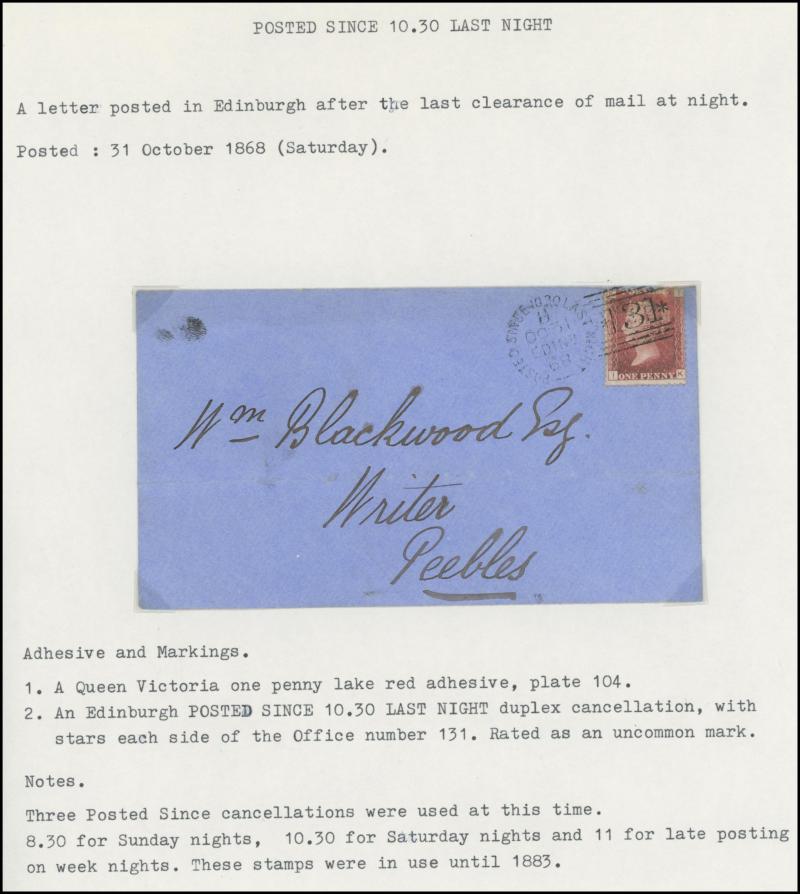 each type known), two examples of the scarce '11 LAST NIGHT' on 1873 Letters 1d and on 1881 QV Envelope 1d pink, the rare '11.30 LAST NIGHT' on 1872 large-part cover, and three examples of the very scarce '8.30 LAST NIGHT' Sunday Night/Monday Morning