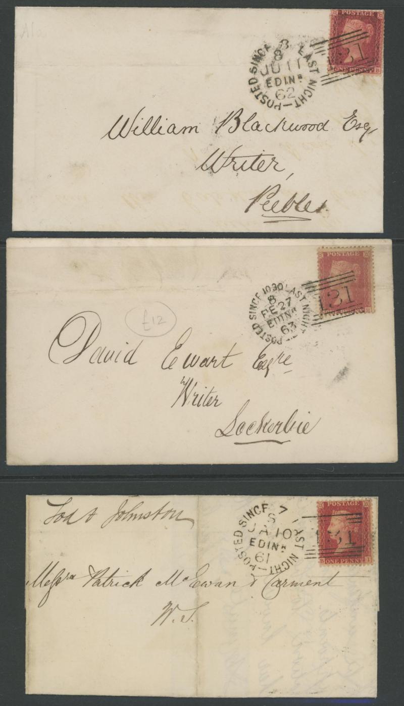 backstamp with Stars 1d tied by very fine 'LEITH WALK' Receiving House handstamp, then an extensive range of the duplex cancels including three examples of '8 LAST NIGHT' (two different types recorded 6.6.1862 to 10.8.1862 only; less than twenty of