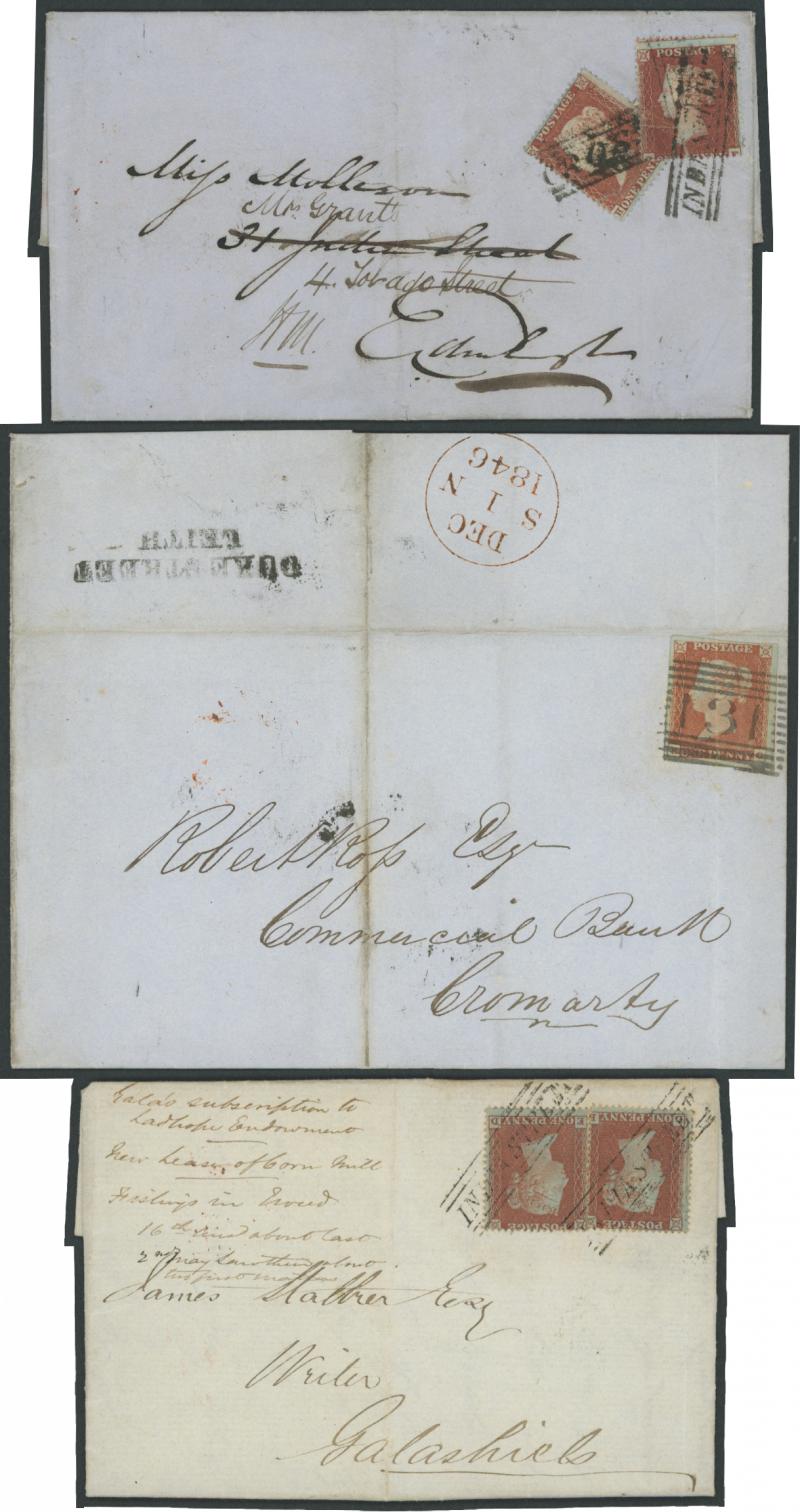entire to Galashiels, 'LAURISTON/PLACE' largely very fine on Stars 1d Blued Paper (very attractive) on 1854 outer, 'LEITH WAL[K]' very fine on Stars 1d on 1855 large-part notice, 'LONDON STREE[T]', 'NICHOLSON/STREET', 'PITT STREET' & 'STOCKBRIDGE'