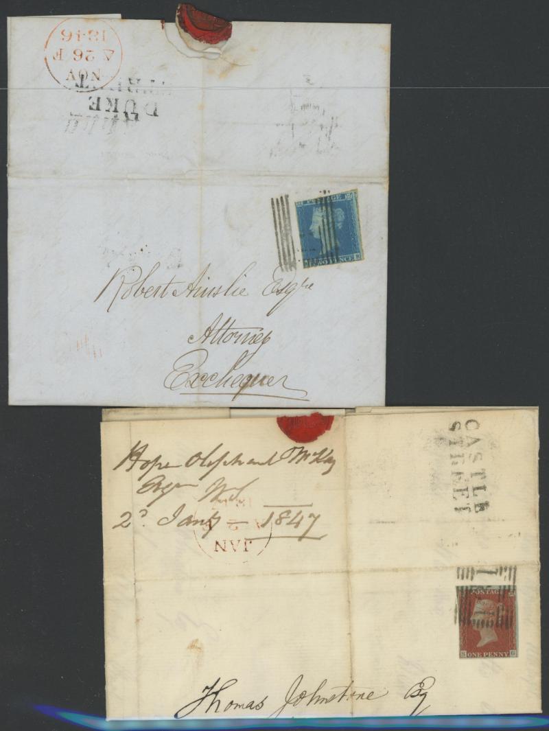 cds without town name (very early usage of first type) backstamp with QV Line-Engraved Stars 1d and another superb April 1856 strike in red-black with Stars 1d tied by 'DUKE STREET' Receiving Office handstamp plus '... 7 LAST NIGHT/AU 19/EDINR/57'