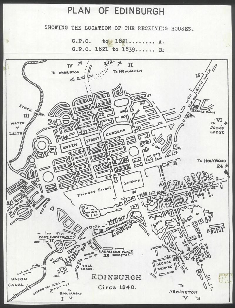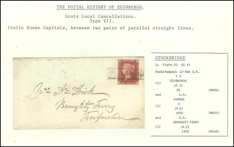 plus 'GRASSMARKET' 1859 backstamp, also pre-1854 usages as despatch markings 'CASTLE/STREET', 'DUKE/STREET', 'DUKE STREET/LEITH' & 'INDIA/STREET' unframed two-line handstamps and 'BRIDGE/STREET' (blue) & 'QUEEN/STREET' boxed two-line handstamps, etc,
