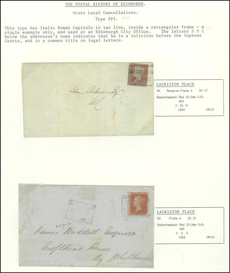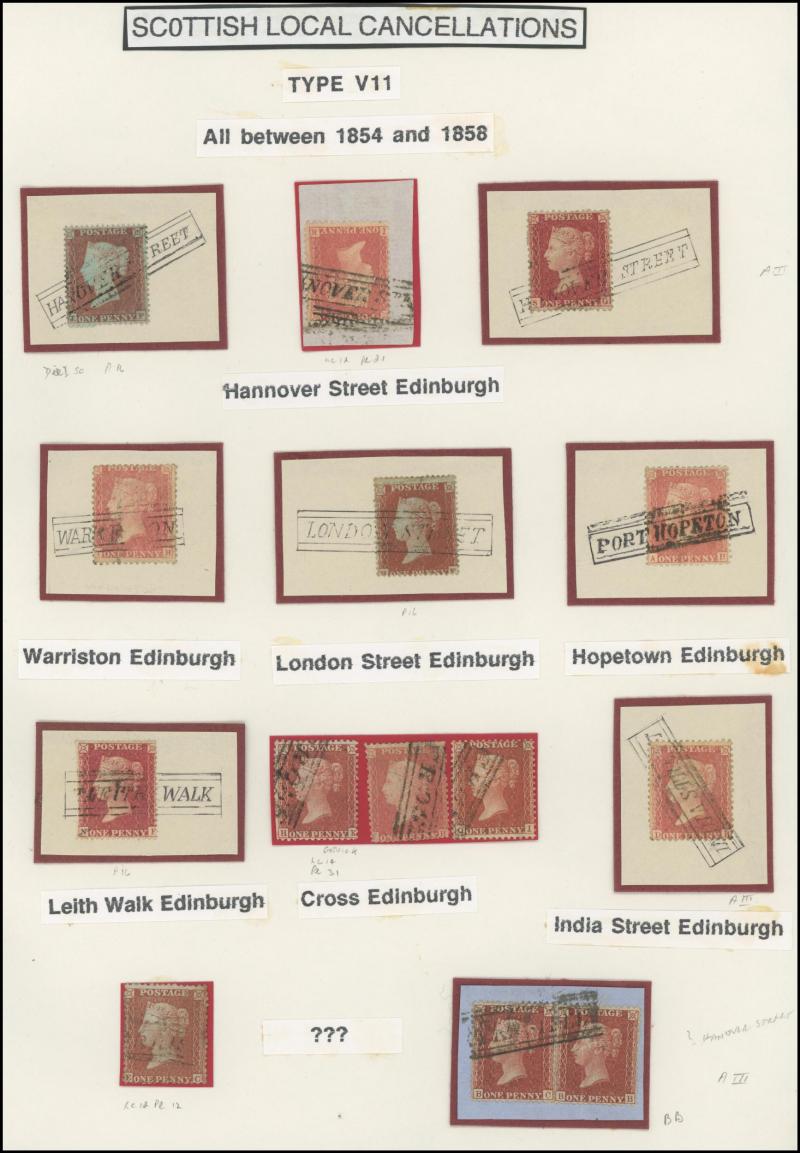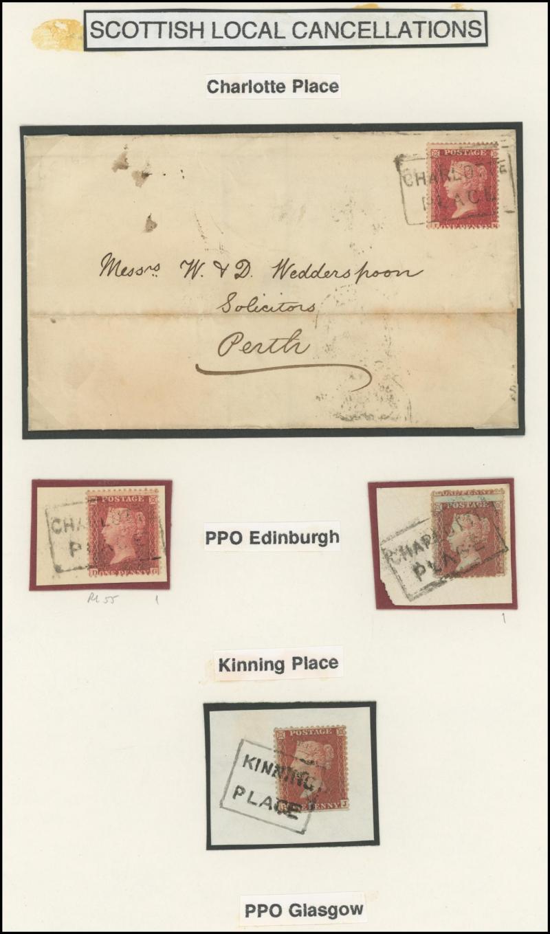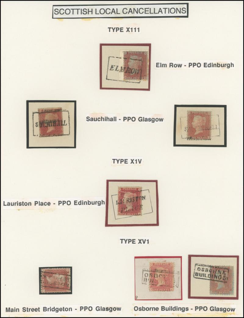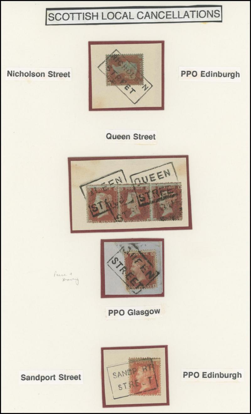 POSTMARKS: Edinburgh Receiving Houses group mostly on annotated display pages with many 'Scots Locals' usages to cancel stamps from
