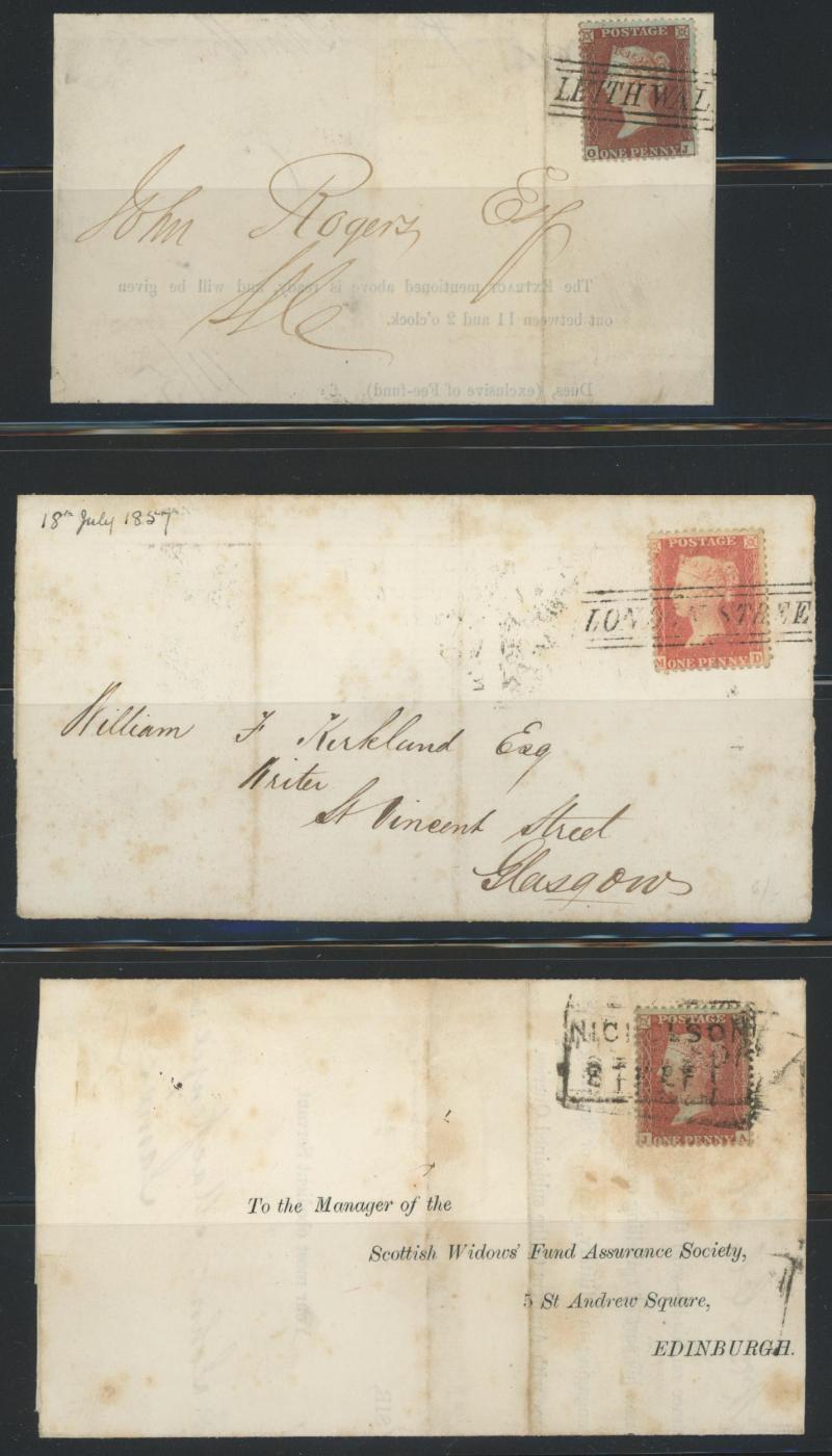 non-duplex backstamps on 1857 outer, 1858 Envelope QV 1d pink and 1858 outer with 1d Stars tied by 'Madeleine Smith' duplex; '10 30 LAST NIGHT' on 1864 envelope tying Letters 1d pair (code '2'; light file fold) plus two 1865 strikes on Letters 1d &