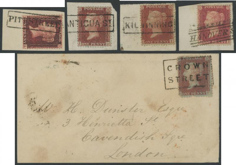 'ANTIGUA ST', 'CASTLE/STREET', 'CHARLOTTE/PLACE', 'DUKE STREET', 'ELM ROW' very fine complete on Stars 1d on 1855 outer, 'HANOVER STREET' largely very fine complete on Stars 1d on 1857 envelope, 'INDIA STREET' x2 on Stars 1d x2 on double-weight