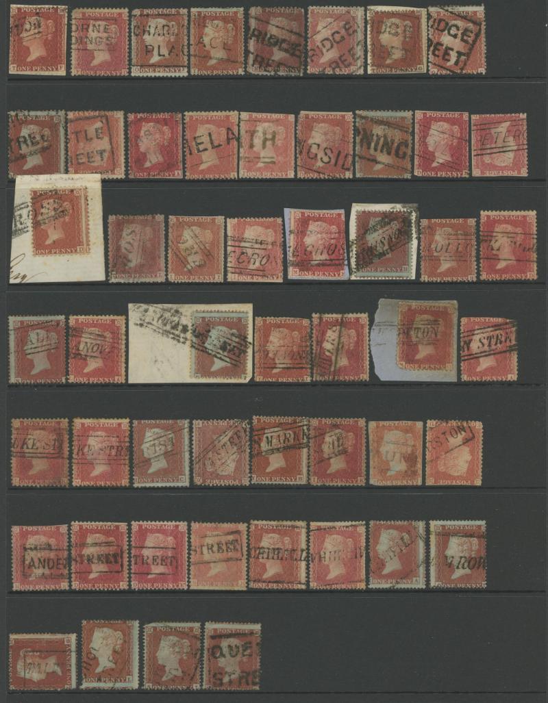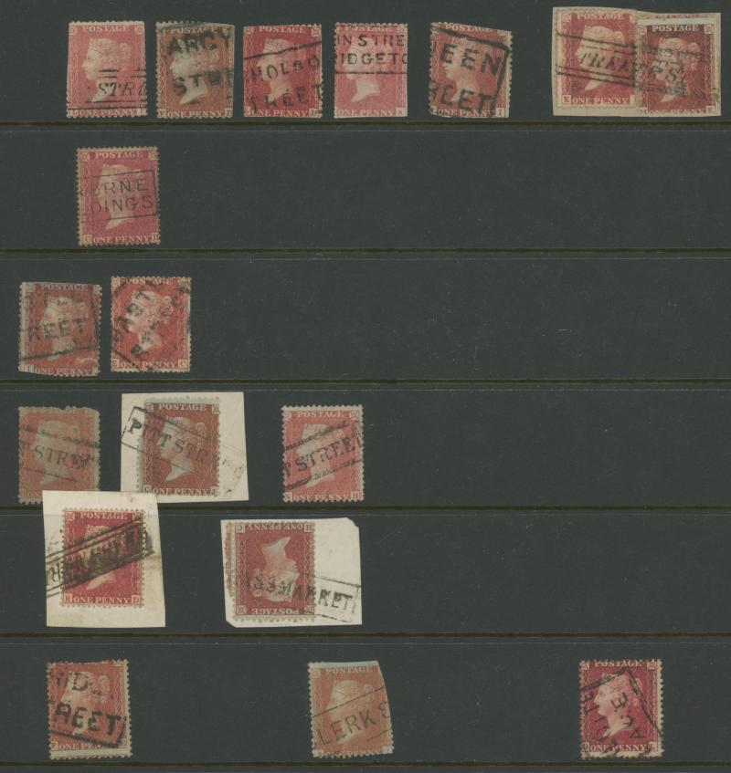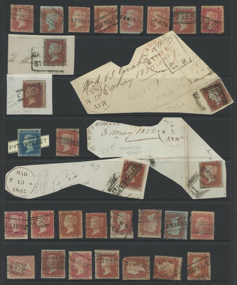 on mostly perforated Penny Reds, a good number of large-part/complete strikes on piece and on a few covers plus many hinged to pieces on which a former owner has neatly ‘completed’ the markings. A very attractive collection.