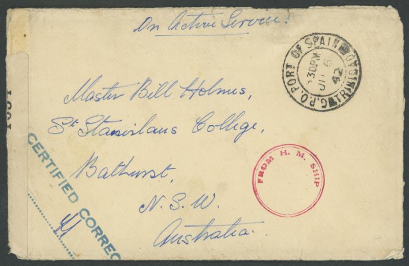 cds of 'SP1/39' (two days before WWII began) and 1943 to Canada with '.../S.S./1' censor label (rated 10); Trinidad 1942 Forces cover to Australia with superb 'FROM HM SHIP'-in-double-circle in red & 'CERTIFIED CORRECT' in blue; British Honduras 1931