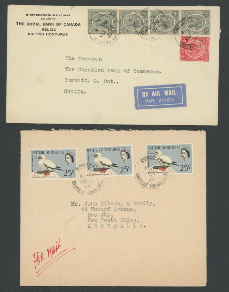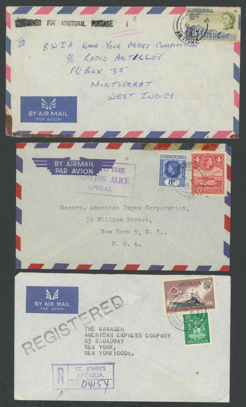 airmail to Canada with KGV 2c & 4c strip of 4; Antigua 1955 Antigua/Leewards combination with '.../PRINCESS ALICE/APPEAL' cachet, 1969 to Montserrat with 'RETURNED FOR ADDITIONAL POSTAGE ("1c")', 1970 to USA with '.../MAIL DAMAGED BY EXCESSIVE RAIN'