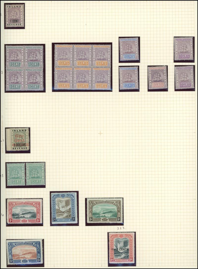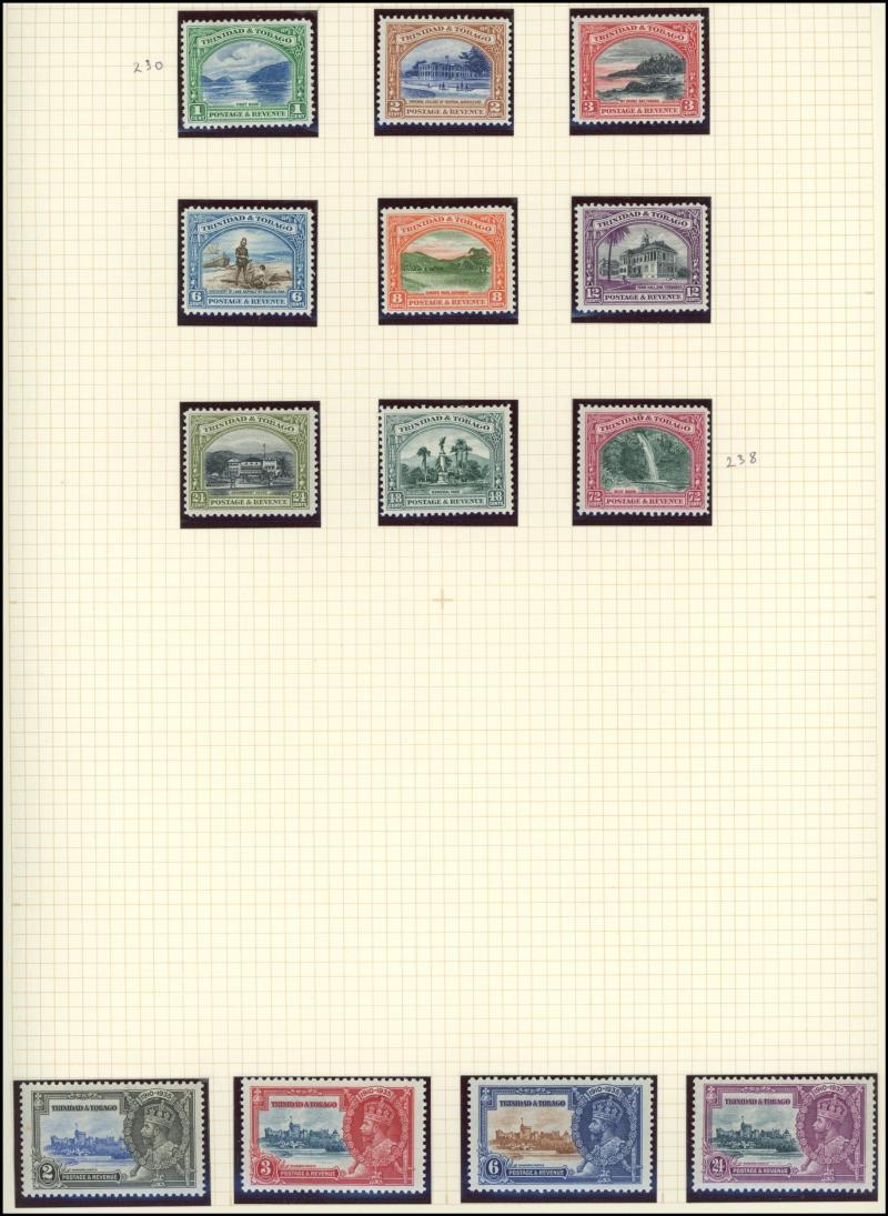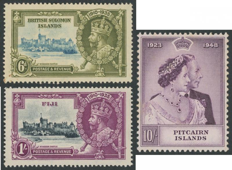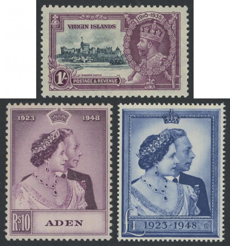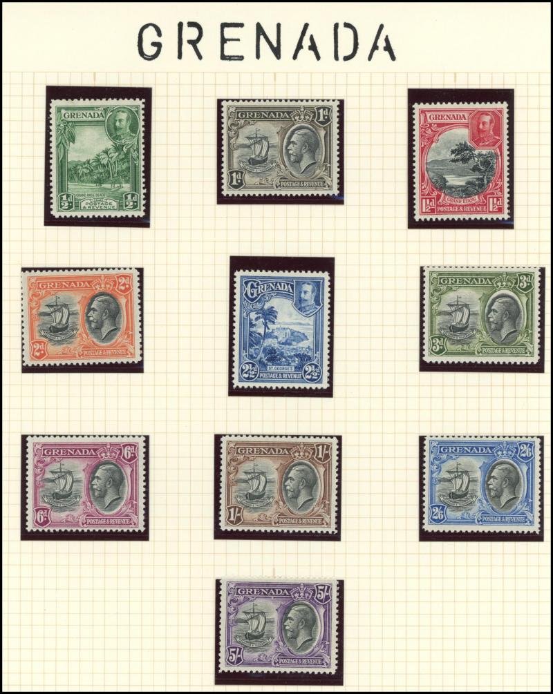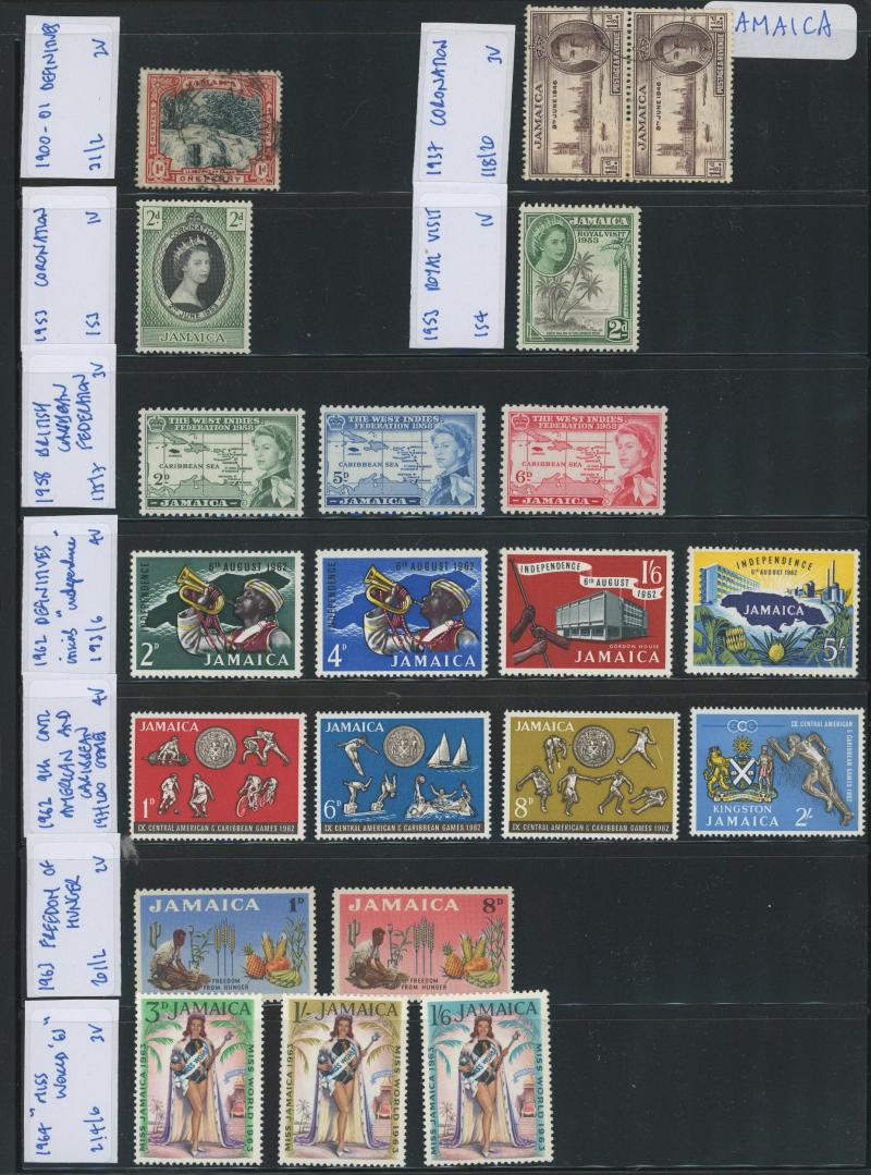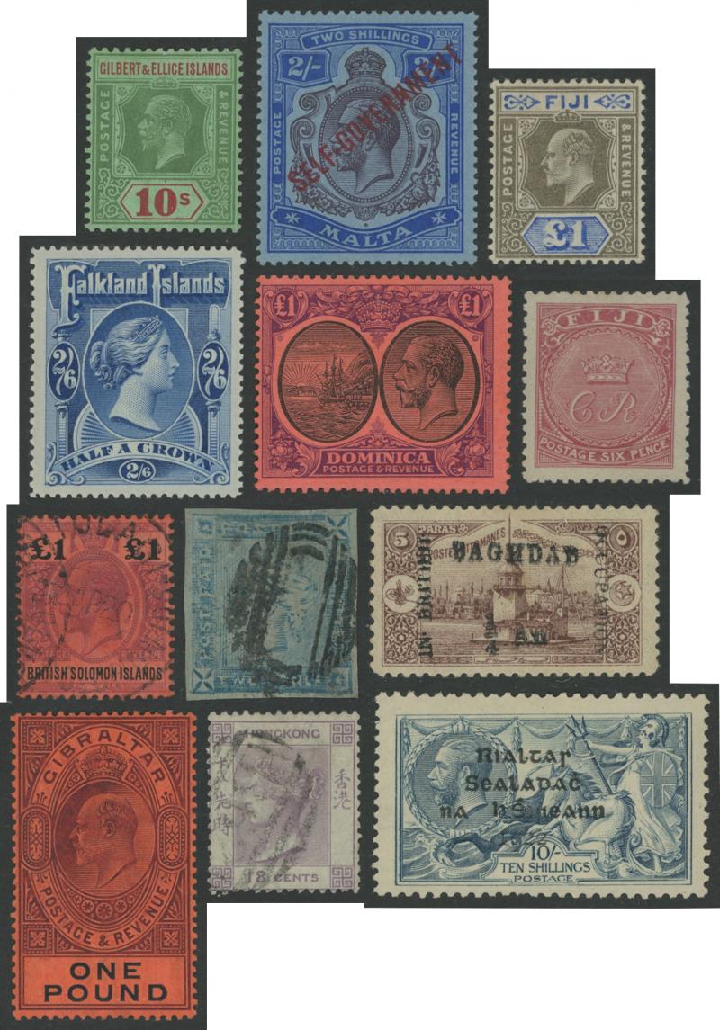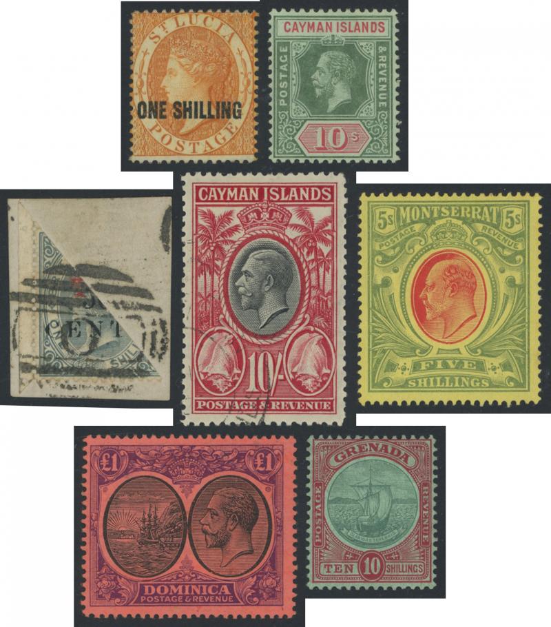 Wmk 5/- *, 1923-33 KGV & Badge £1 *, Grenada 1906-11 Badge set *, Jamaica 1919-21 KGV Pictorials Multiple Crown CA Wmk set * & 19211-29 Script CA Wmk set used, Leeward Islands 1890 QV Keyplates 5/- plus 1897 Jubilee handstamp 5/- (not expertised) *,