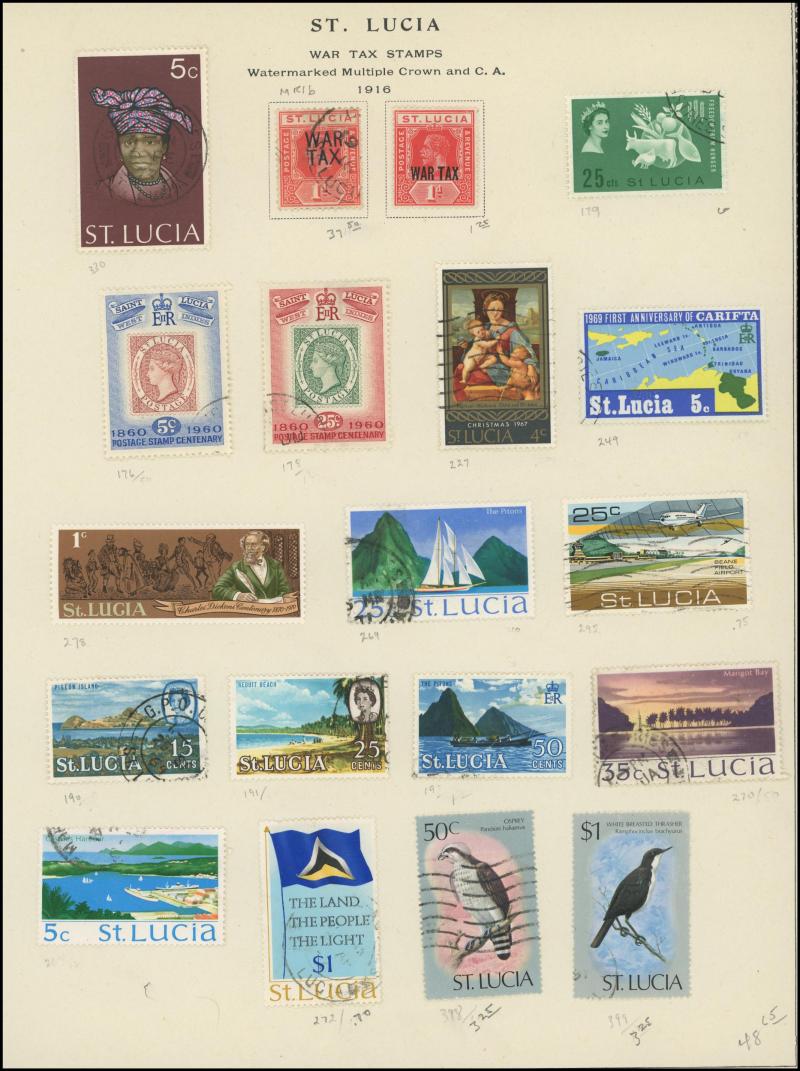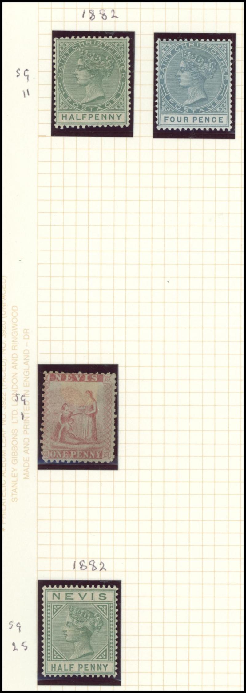 CC Wmk Perf 14 4d unused and Crown CA Wmk 2½d brown, 6d & 1/- *, 1885 'Halfpenny' Surcharge on bisected QV 1d unsevered pair and 1903 Columbus Crown CA Wmk set * plus Nevis 1867-76 Badge 4d orange *, St Lucia 1860 QV Small Star Wmk 1d, 4d & 6d and