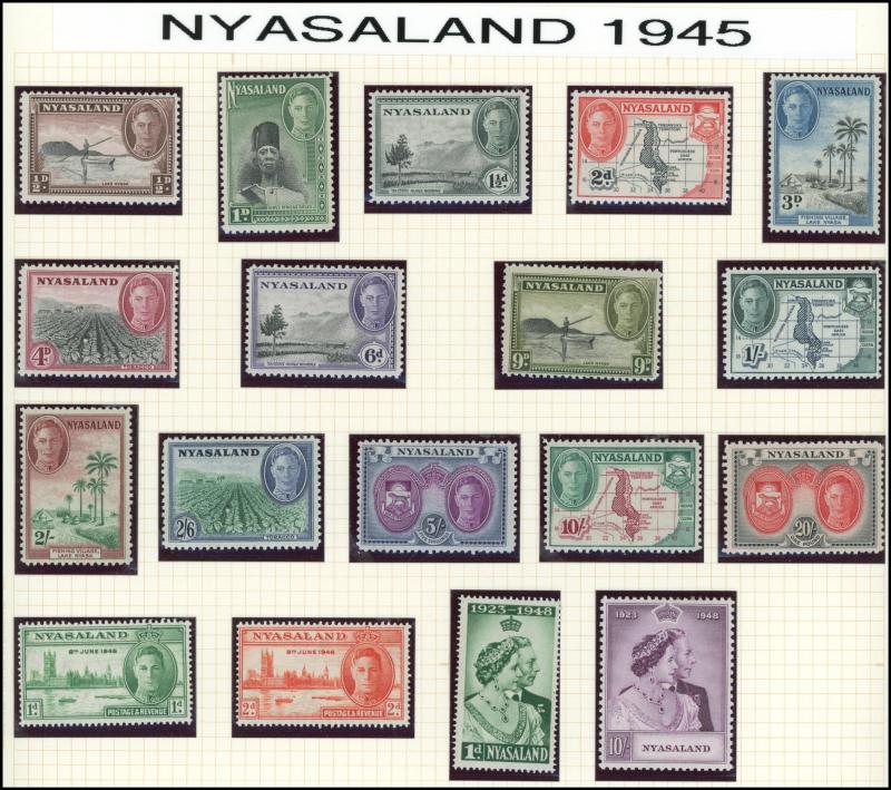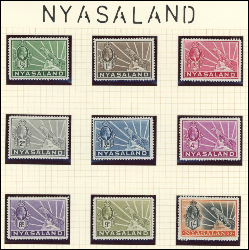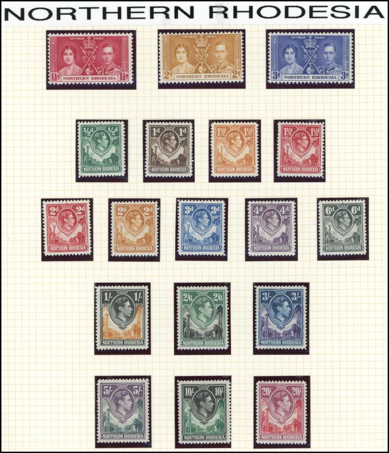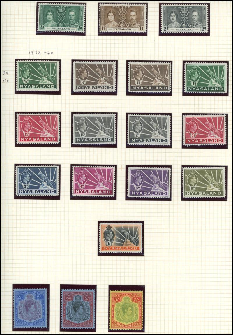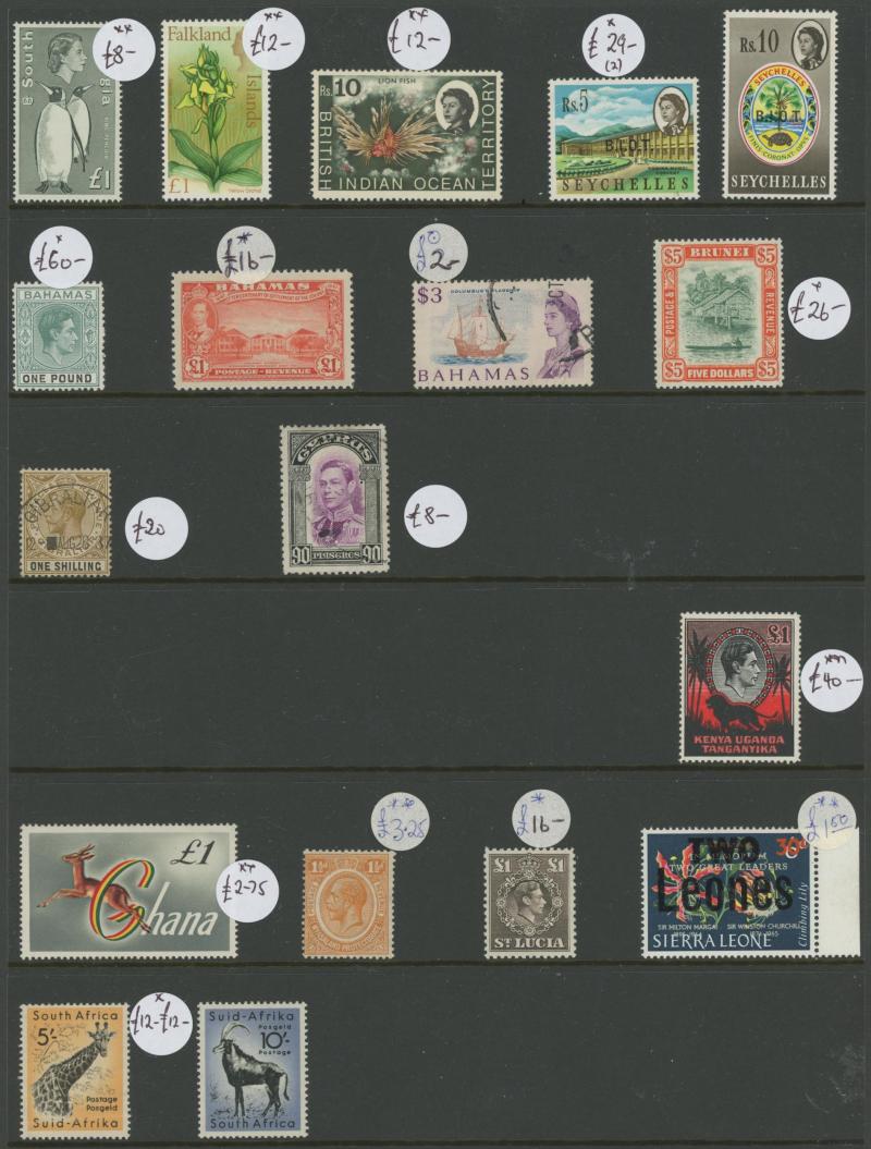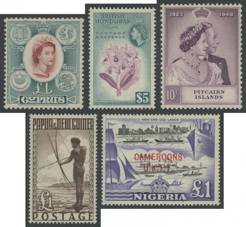 unused (tiny aging mark), Nigeria 1914-29 KGV Keyplates £1 Die II * and 1936 KGV Pictorials £1 *, Rhodesia 1892 Arms £1 & £2 used plus £5 * (well-centred & fresh; pulled perf at top), 1910-13 KGV Double Heads Perf 14 2/6d & 3/- * plus 5/- used plus