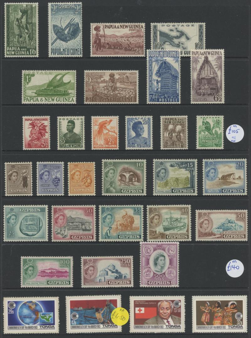 (**); Cook Islands with Aitutaki & Penrhyn including QEII blocks of four ** (Cat stated to be £750); Cyprus with 1955 Pictorials to £1 (*); Falklands/South Georgia FDCs; Gibraltar FDCs; Jamaica; Maldives; Malawi; Papua New Guinea with 1952 to £1 (*);