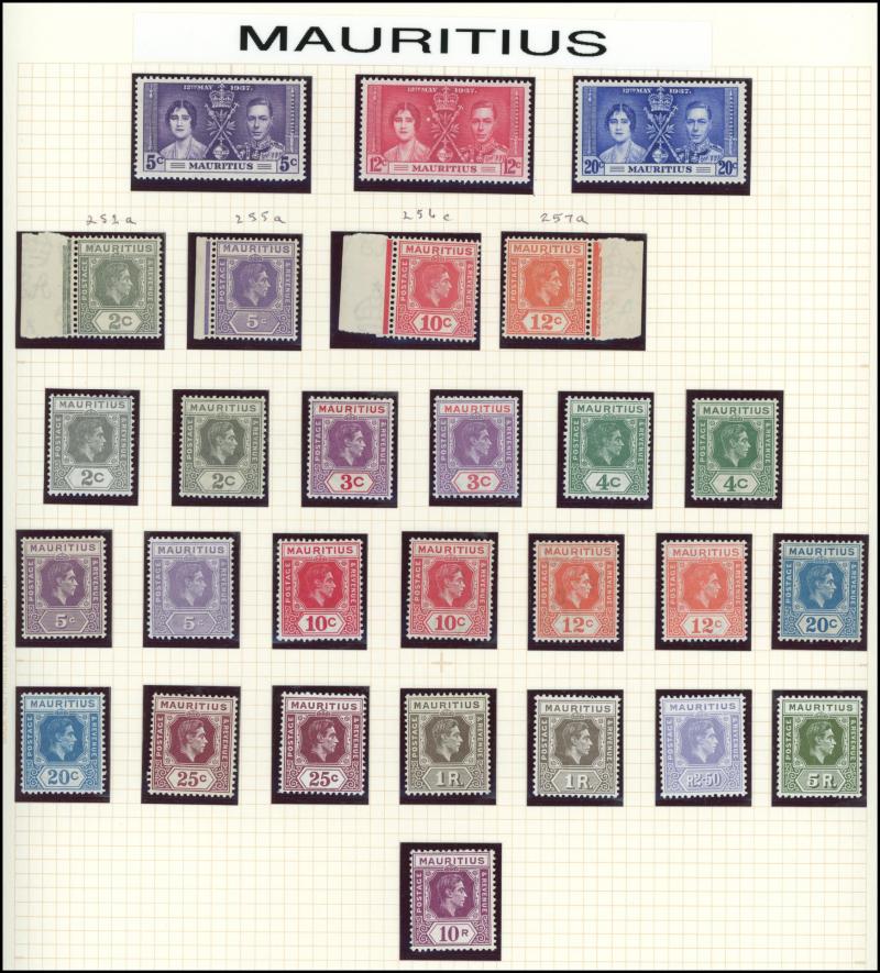 1889-94 QV Keyplates 5/- mauve & blue *, 1938-43 KGVI Accra set used and 1948 KGVI Pictorials **, Hong Kong 1948 Wedding duo *, KUT 1938-54 KGVI Pictorials simplified set *, Mauritius 1938-59 KGVI Heads & 1950 KGVI Pictorials, Northern Rhodesia