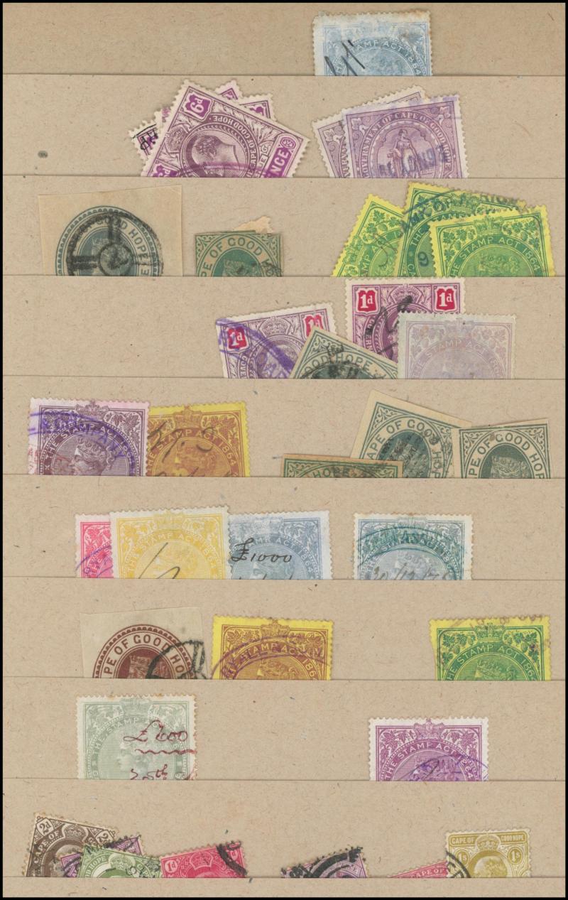 British Africa selection of better items including Bechuanaland 1888 Overprints on GB Revenues 3d, 2/- & 5/- * plus £1 with fake