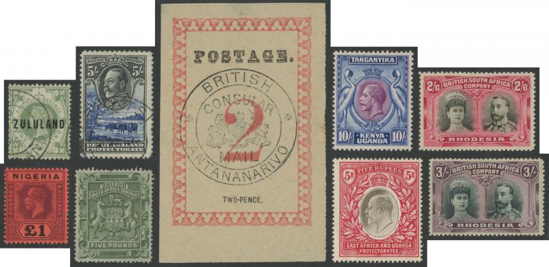 5/- & 10/- * plus East Africa & Uganda 1903 KEVII Crown CA Wmk ½a to 8a, Crown CC Wmk 1r & 2r and Multiple Crown CA Wmk 3r, 4r & 5r * plus 1912-21 KGV Keyplates Multiple Crown CA Wmk set to 10r * plus a few extras, Madagascar 1886 Consular Mail 2d