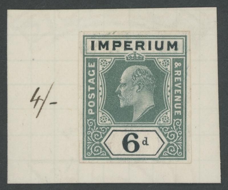 1907 KEVII Keyplates 'IMPERIUM' 6d green & black imperforate colour trial mounted on a small piece of graph-lined thin card from