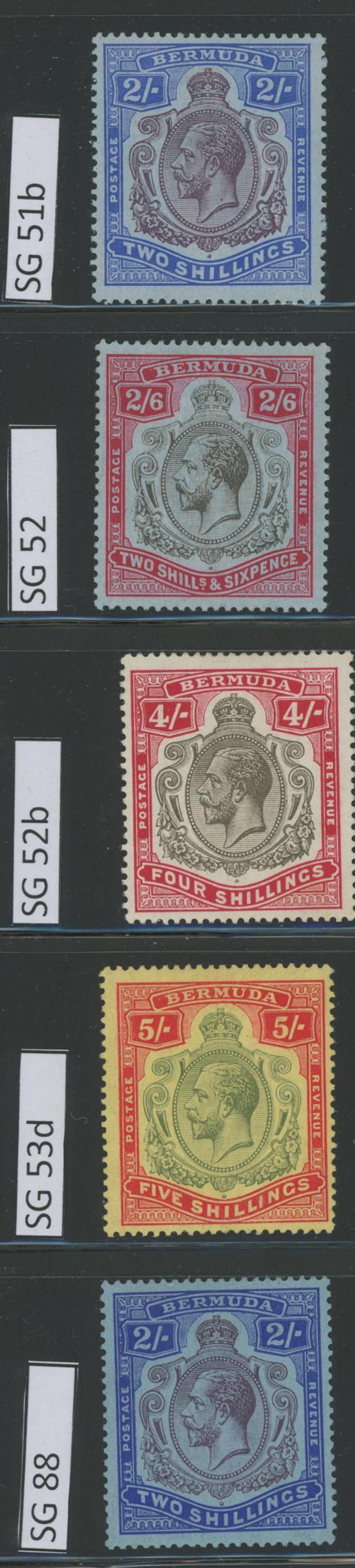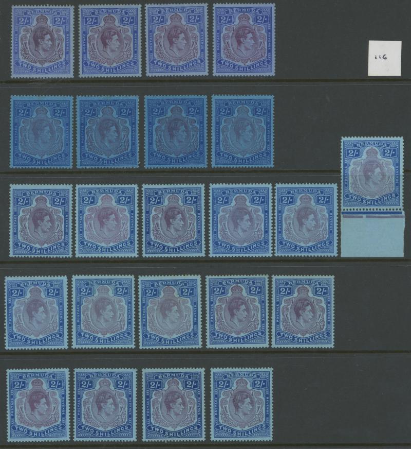 14¼ deep purple & ultramarine/ grey-blue SG 116b, 2/- purple & blue/deep blue SG 116c x4 and 2/- Perf 13 x14, 2/6d Perf 14 x9 and 2/6d Perf 13 x22, 5/- Line Perf 14¼ dull yellow-green & red/yellow x2, 5/- Perf 14 x12 and 5/- Perf 13 x22, 10/- Line