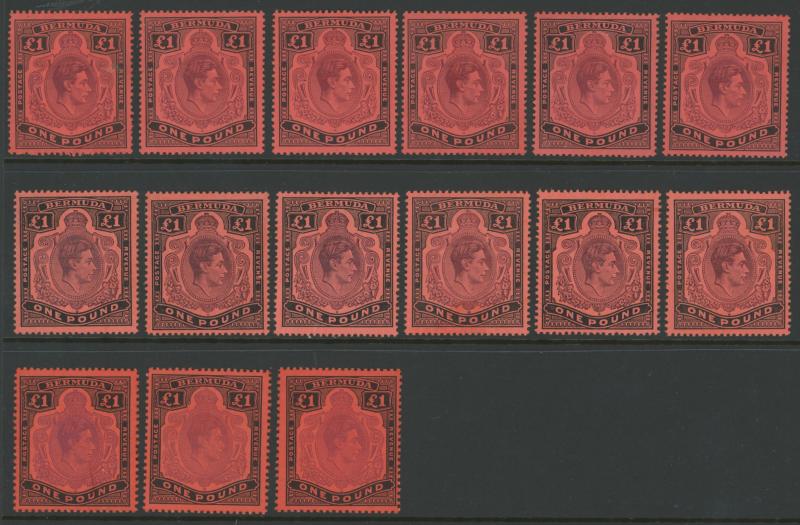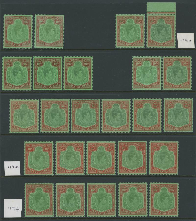 Perf 14¼ yellow-green & carmine/green x3, 10/- Perf 14 x13 and Perf 13 x10, 12/6d grey & brownish orange x13, 12/6d Perf 14 grey & pale orange x4 and 12/6d Perf 13 x2, and £1 Perf 14 x13 and Perf 13 x3, some are unmounted but mostly lightly mounted