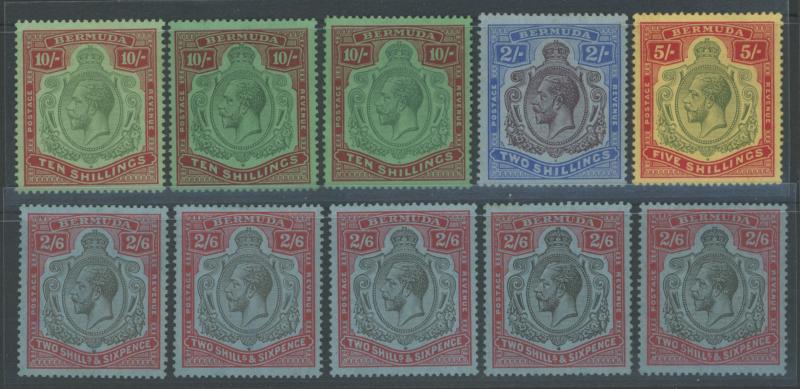 black/red plus 1924-32 Multiple Script CA Watermark 2/6d black & carmine/blue x5, 2/6d black & red/blue and 2/6d black & bright orange-vermilion/deep blue SG 89k (Cat £2500), 10/- green & red/pale emerald and 10/- green & red/deep emerald x2, and