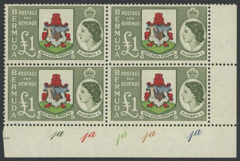 apparently complete from 1953-62 QEII Pictorials set Plate Number blocks of 4 including £1 Plate Number '1' & 1a' blocks and Bradbury Wilkinson Imprint blocks including 2/-, 5/-, 10/- & £1 a few in blocks of 8 with complete imprint & plate numbers,
