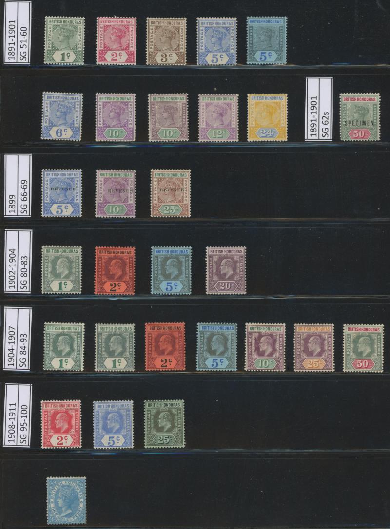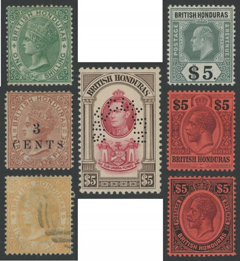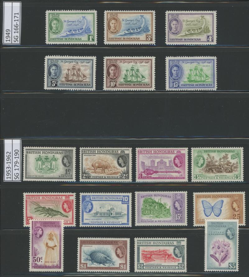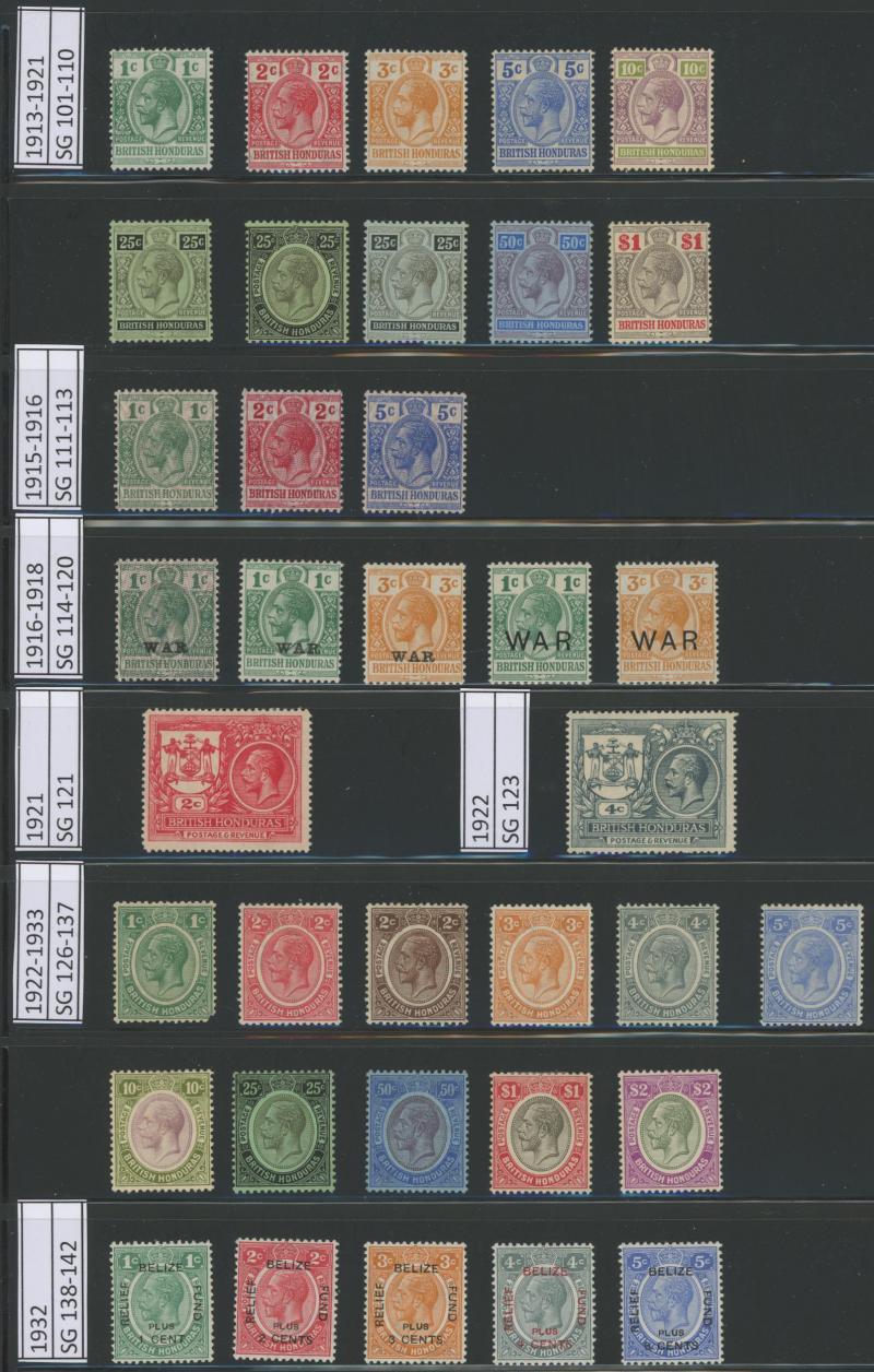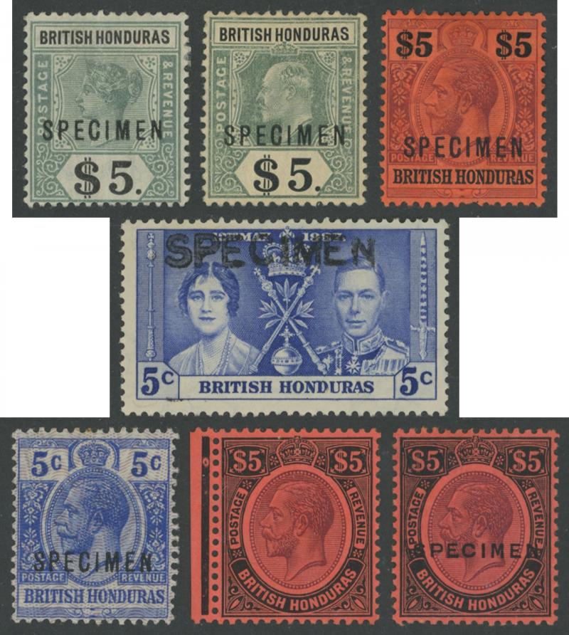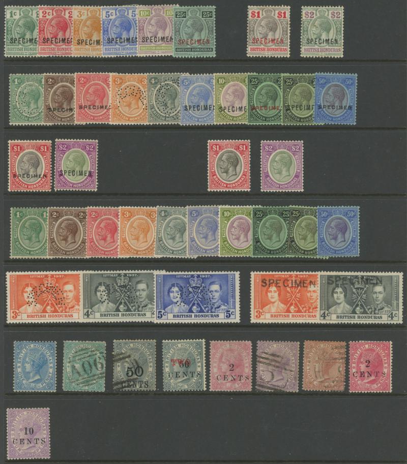 New Design set * (ex Multiple Script CA Wmk 25c & 50c) plus $5 'SPECIMEN' overprint, 1932 Belize Relief Fund overprints set * & punctured 'SPECIMEN', 1938-47 KGVI Pictorials set */**, used and punctured 'SPECIMEN' **, 1948 Wedding $5 Bradbury