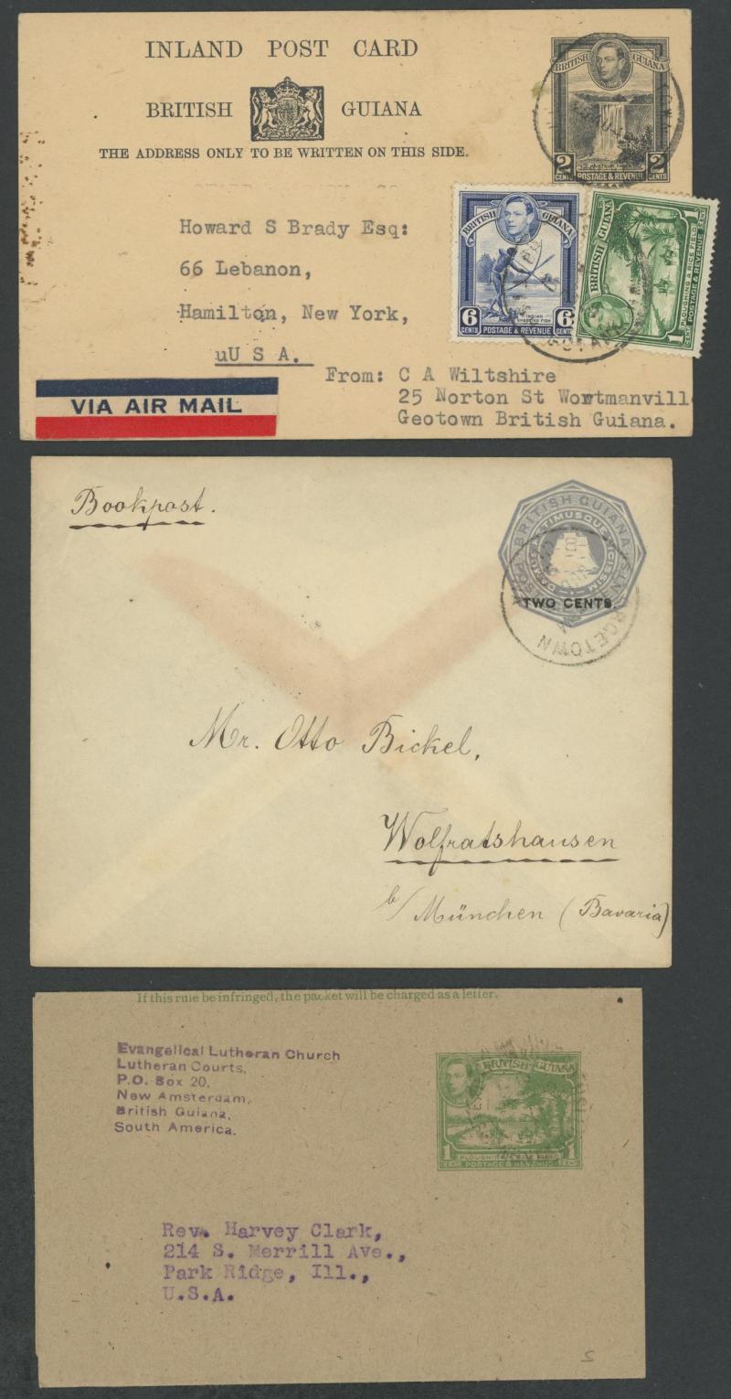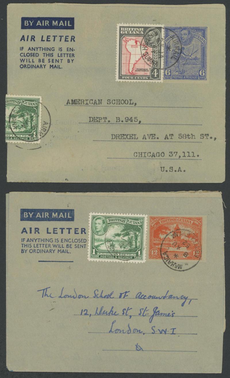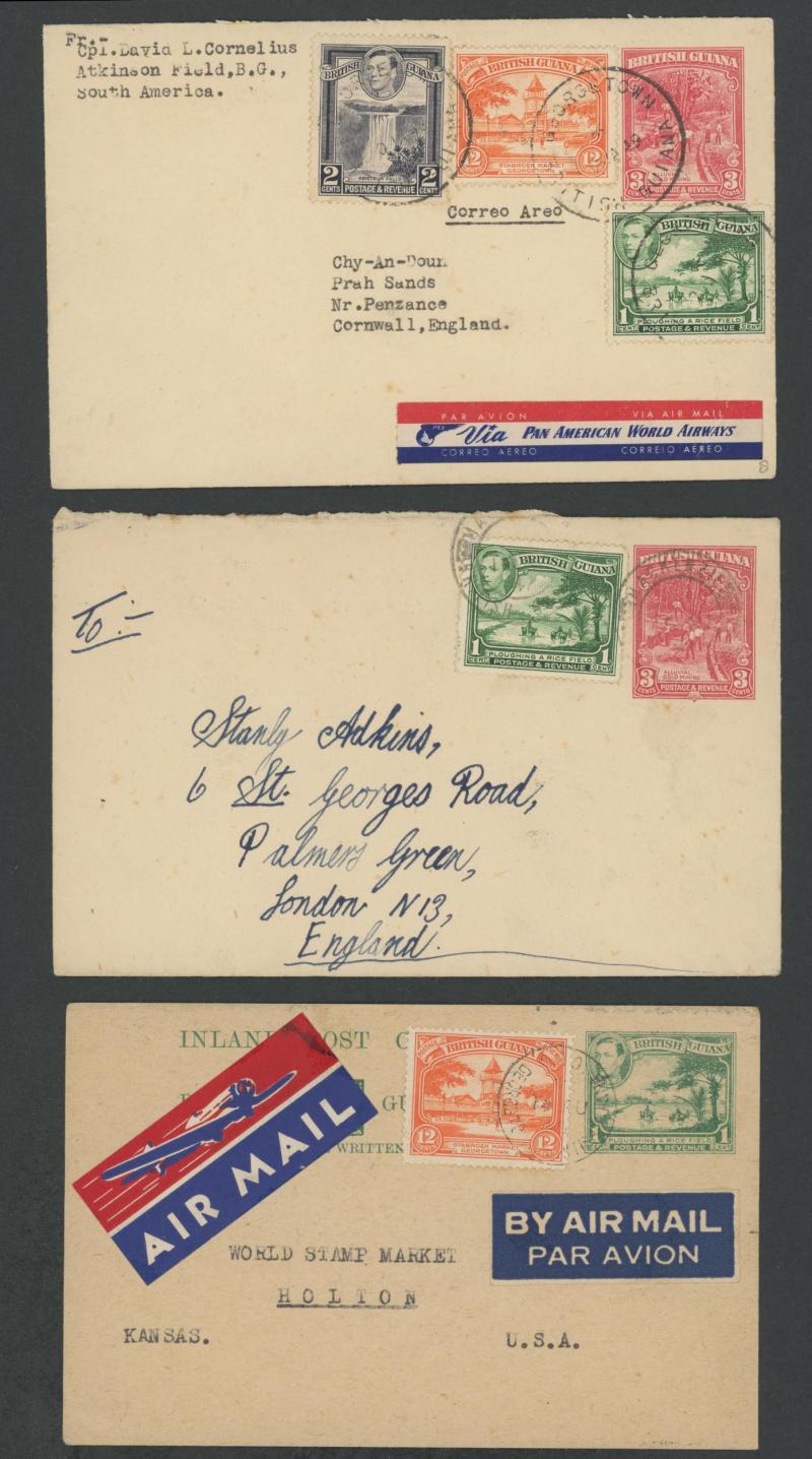 POSTAL STATIONERY: Selections of Postal Cards KGVI 1c plus 12c Market and 2c plus 1c Rice & 6c Fishing both to USA; Envelopes x32