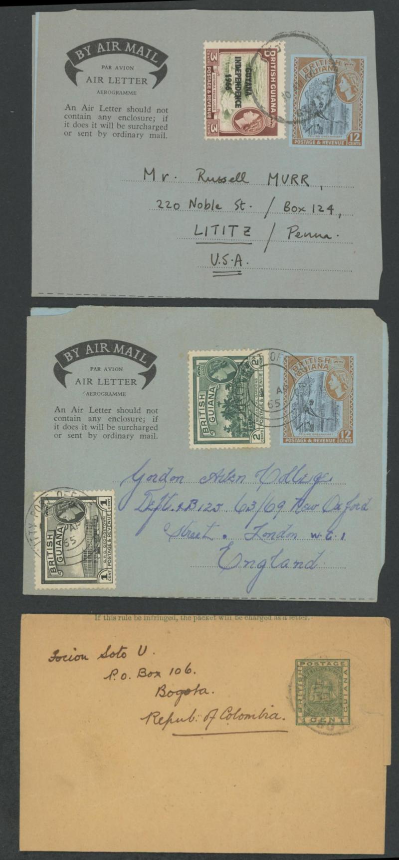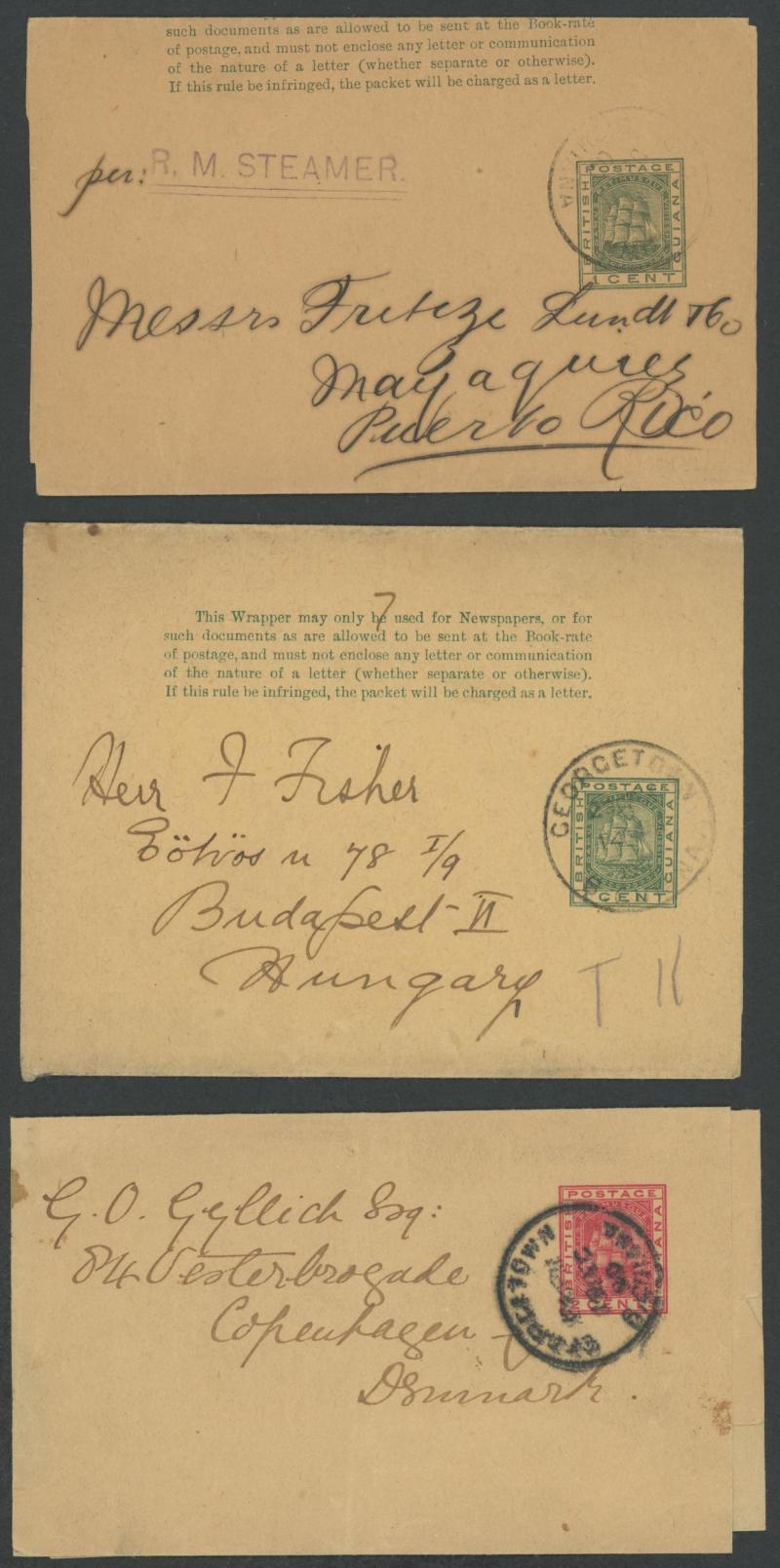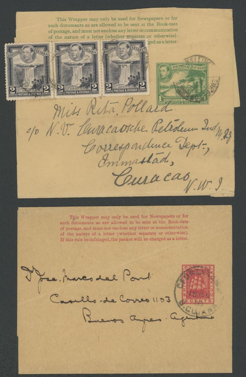 three larger sizes unused; Wrappers x17 including to Argentina, Colombia, Curacao, Denmark, Hungary and Puerto Rico; and Aerogrammes KGVI 12c plus 1c, 1953 formular registered to GB, QEII x11 including 1965 from 'KITTY POST OFFICE' and four with