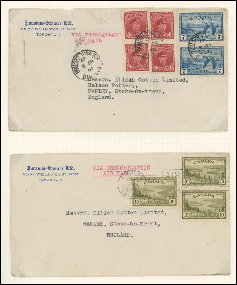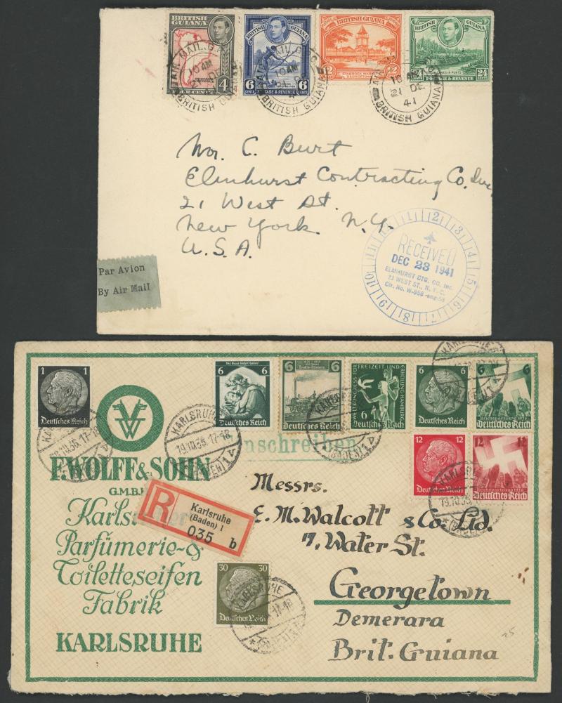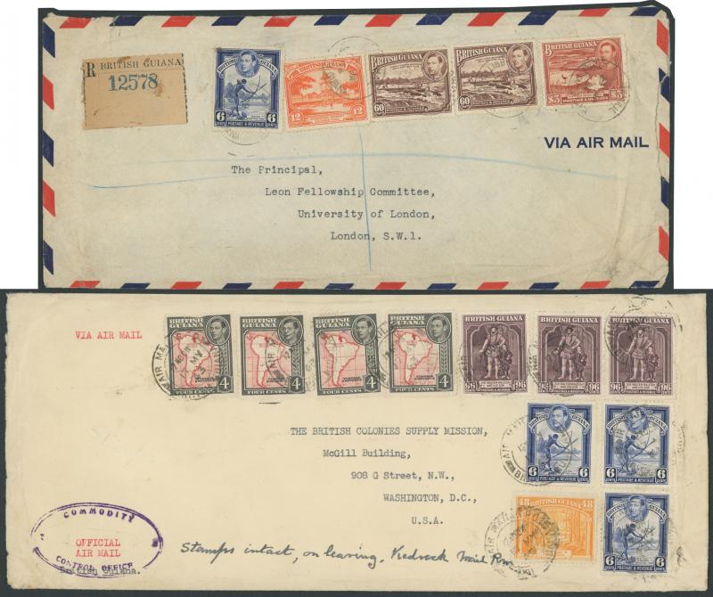 strip of 3 paying $2.30 rate for 2½oz; and 2) with 4c x4, 6c x3, 48c & 96c single & pair paying $3.70 for 4oz stated to be the highest-rated such item recorded; post-WWII airmails to India (faults), Puerto Rico, Venezuela, GB 1946 registered with 6c